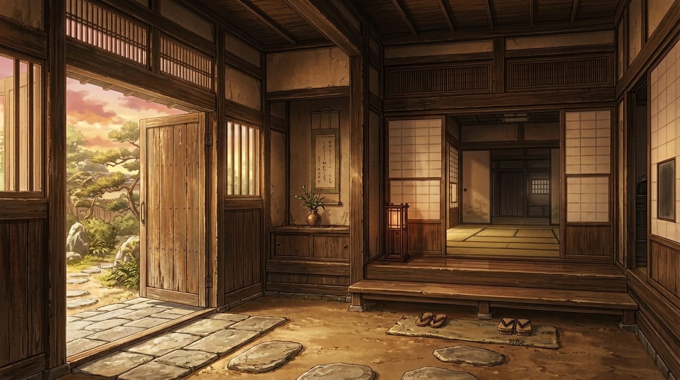 夕焼けが差し込む古びた和風屋敷の玄関内観|和風室内の背景イラスト素材