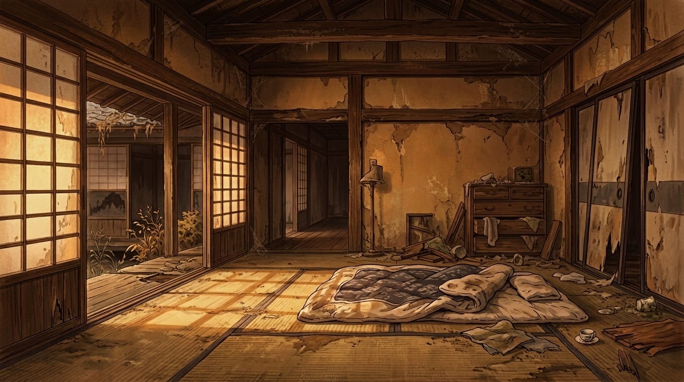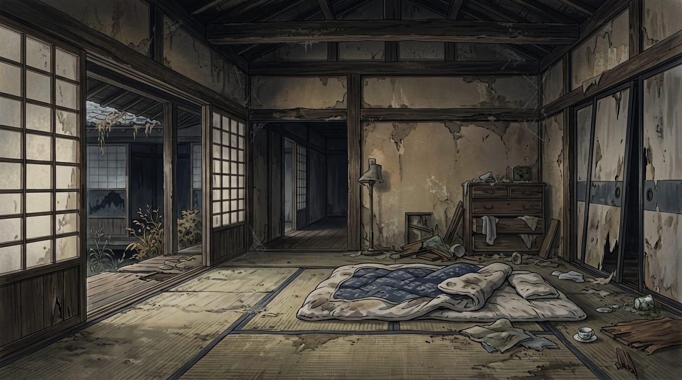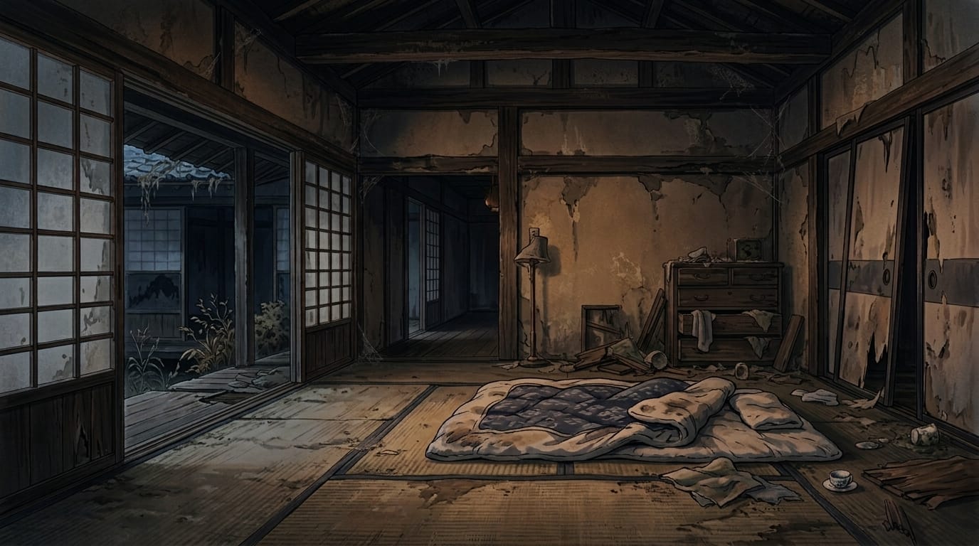 荒れた和室と布団が残る古びた屋敷内部|廃屋風の背景イラスト素材