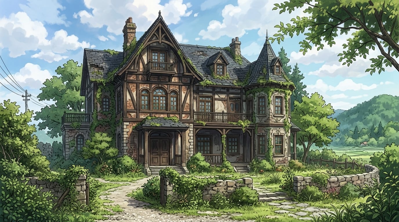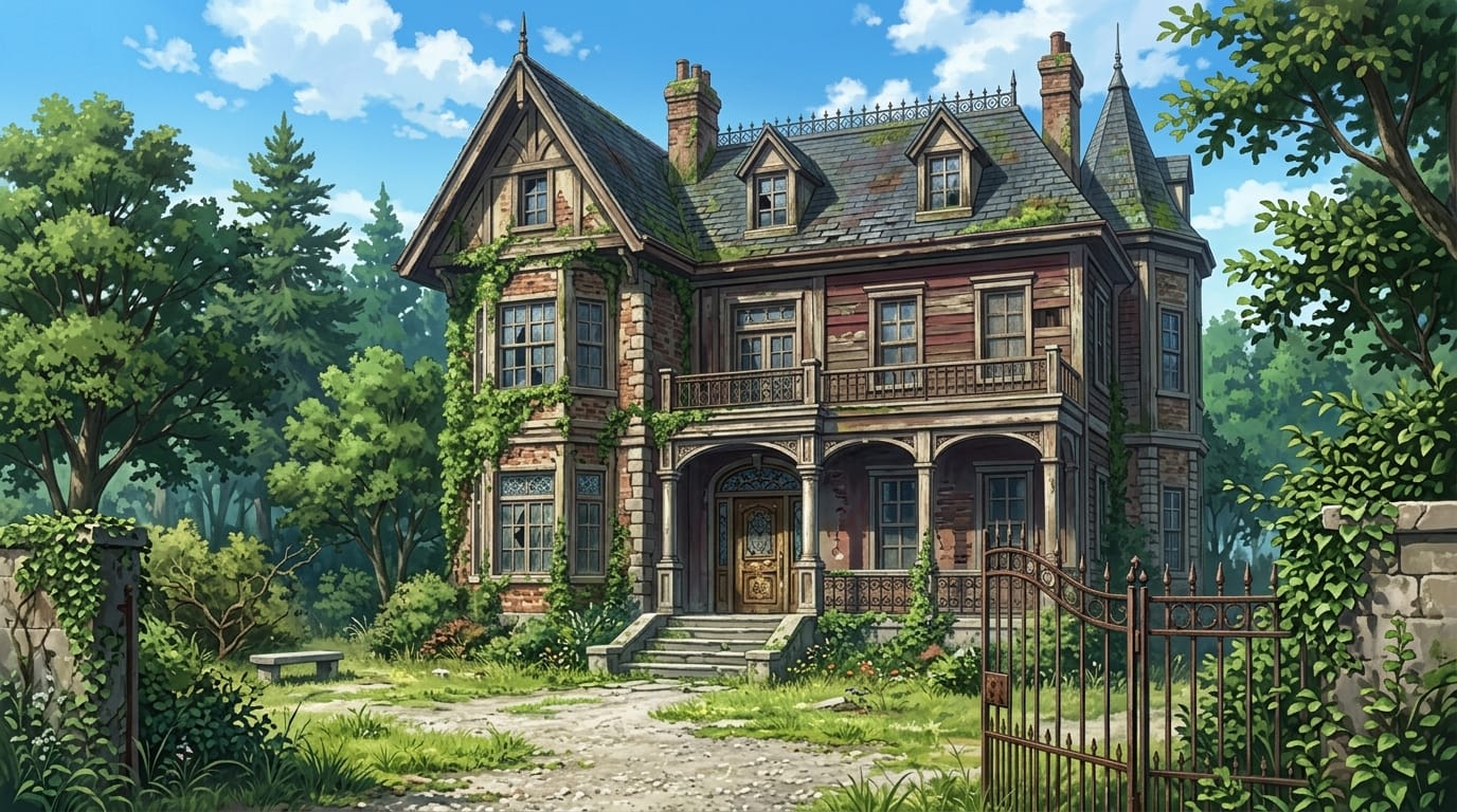 古びた洋館の背景イラスト素材を無料配布。16:9の横長構図でPC向け作品に使いやすい背景イラストです。漫画・Webtoonやゲーム背景として商用・トレース利用もOK!