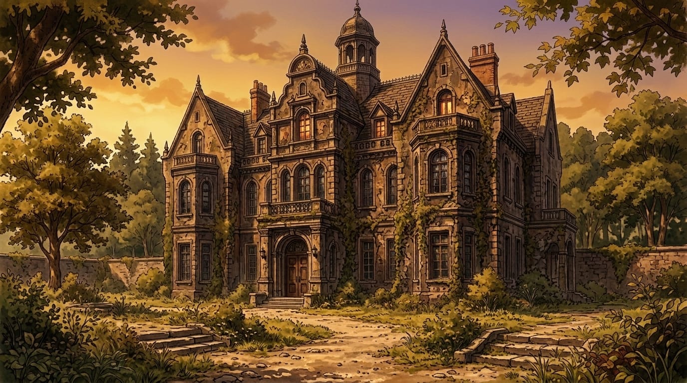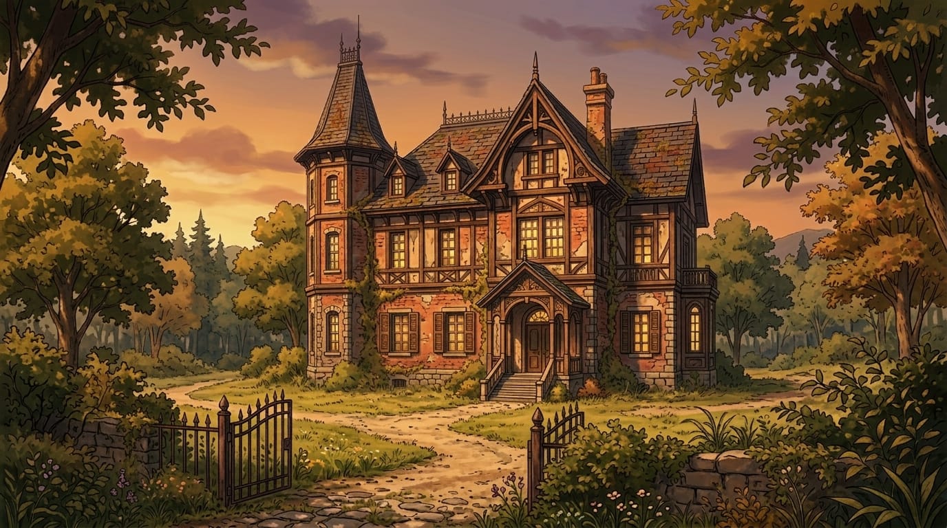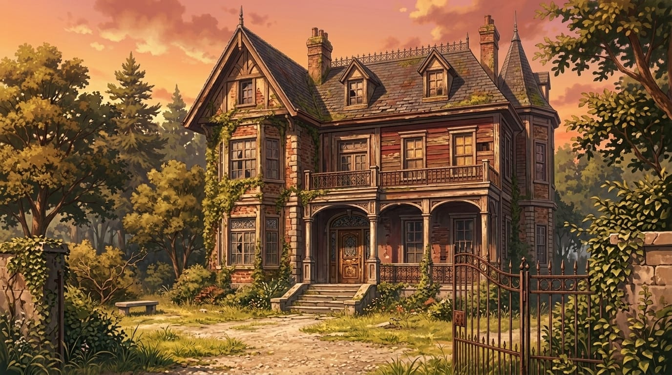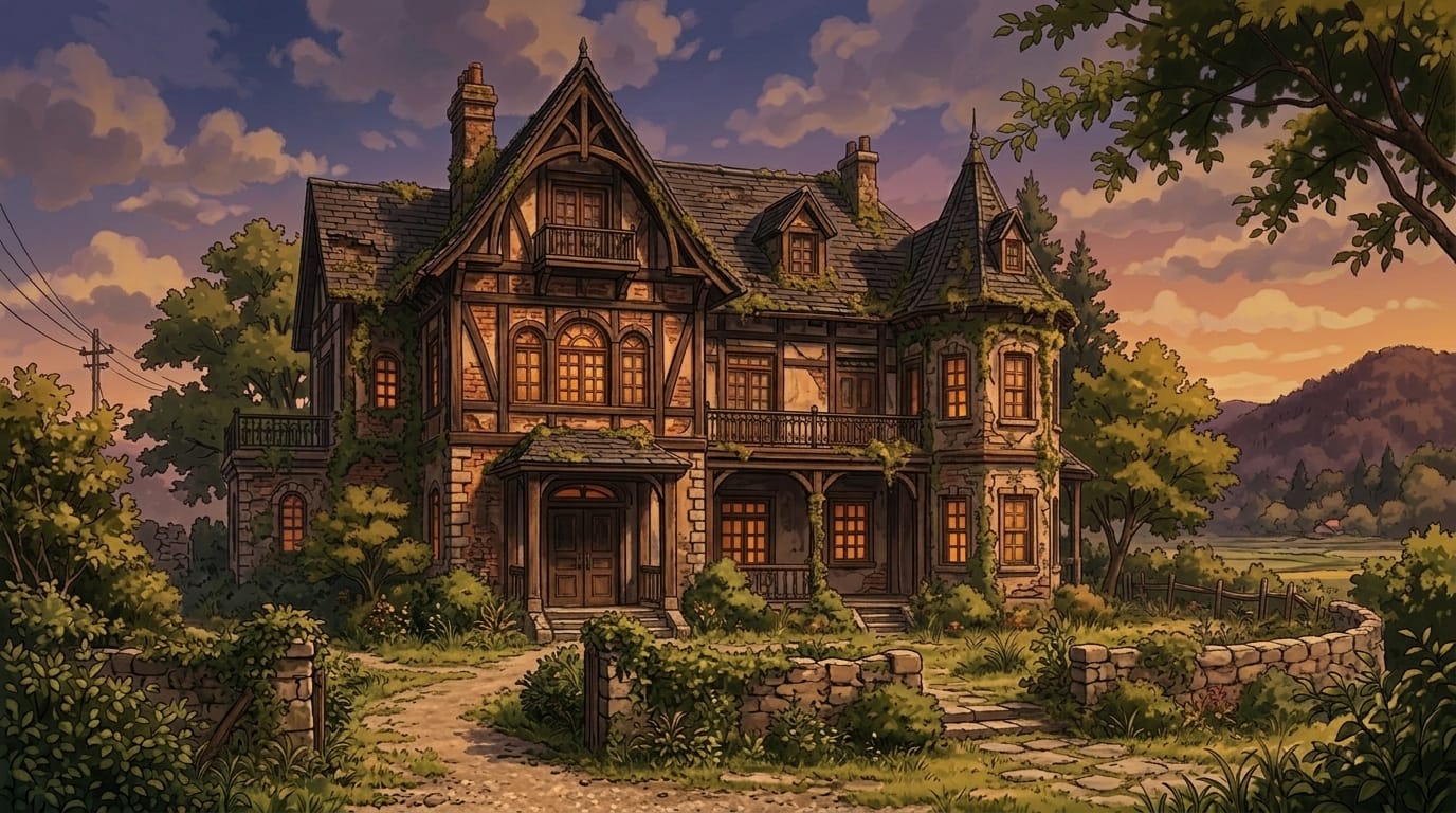 夕暮れに佇む古びた洋館の外観|背景イラスト素材