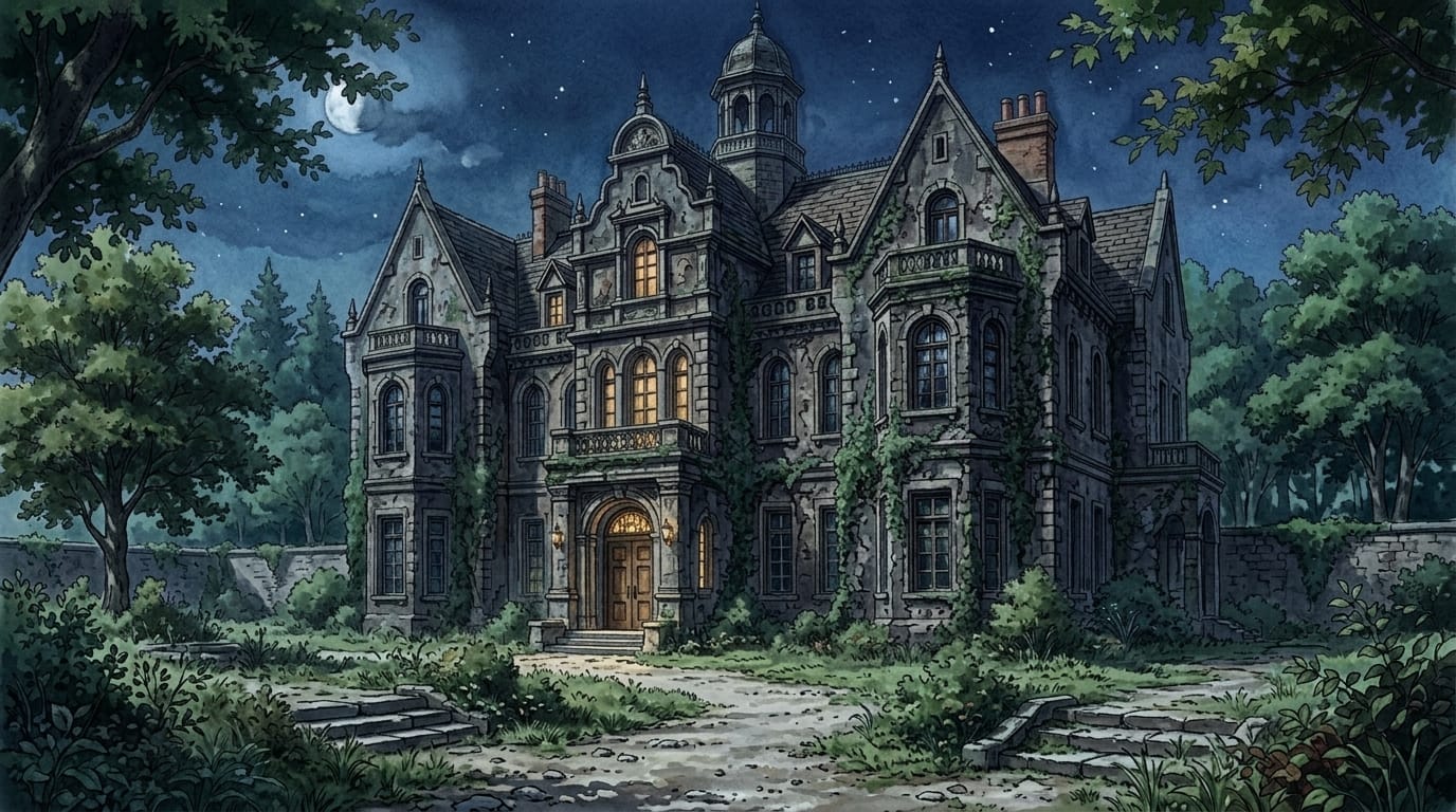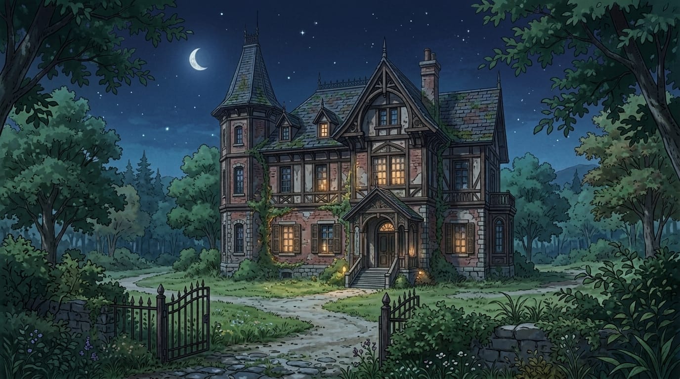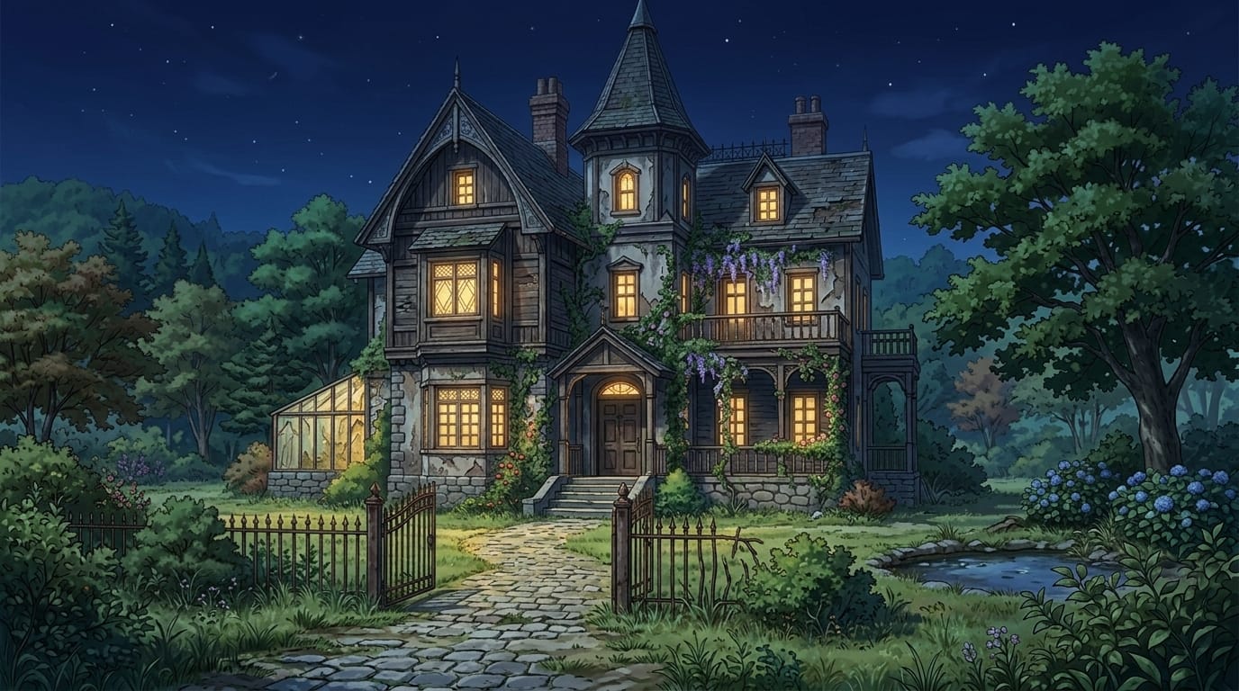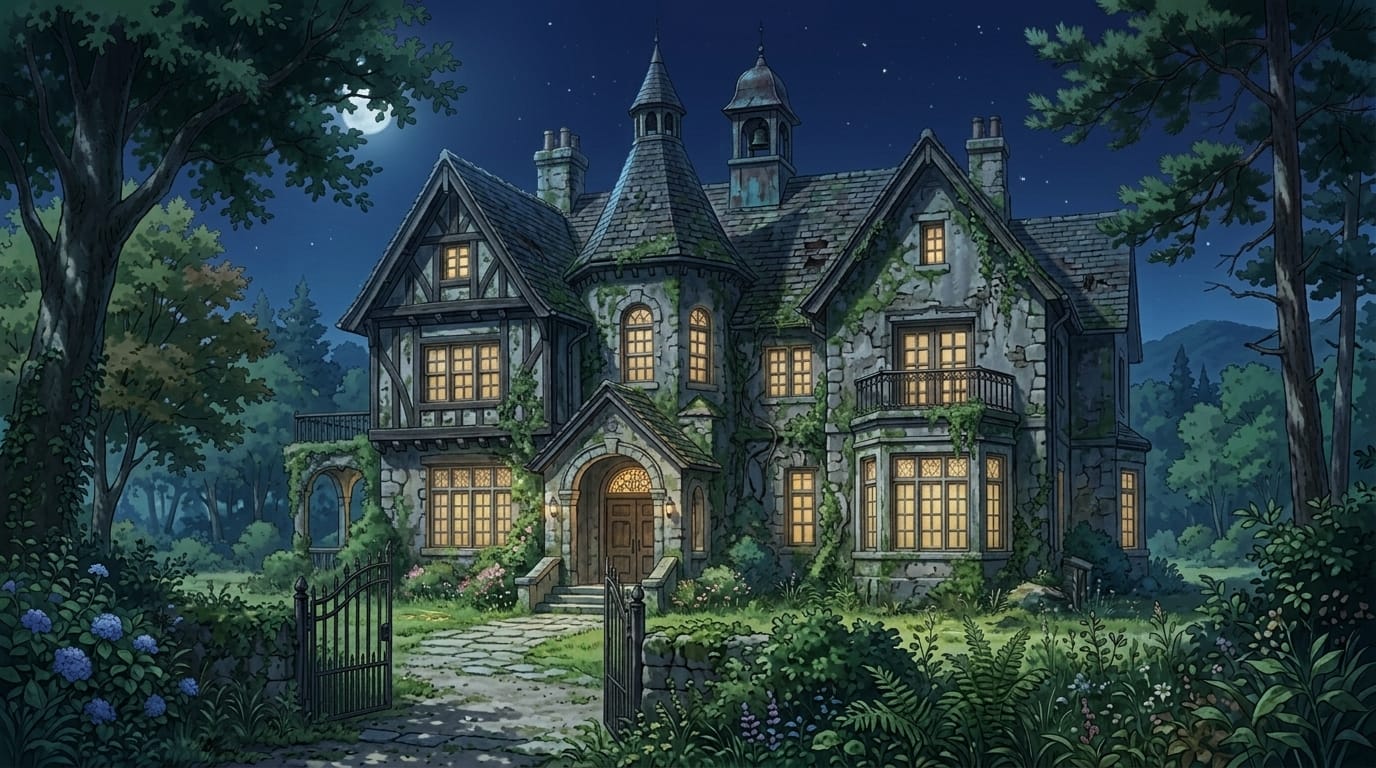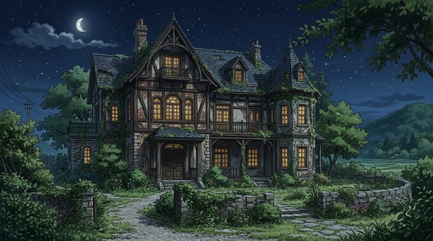 星空の夜に静かに佇む古びた洋館を描いた背景イラスト素材で、神秘的で落ち着いた雰囲気を演出できます。