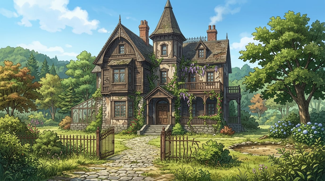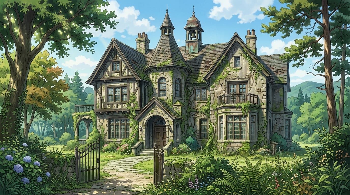 緑に包まれた古びた洋館と自然庭園|背景イラスト素材