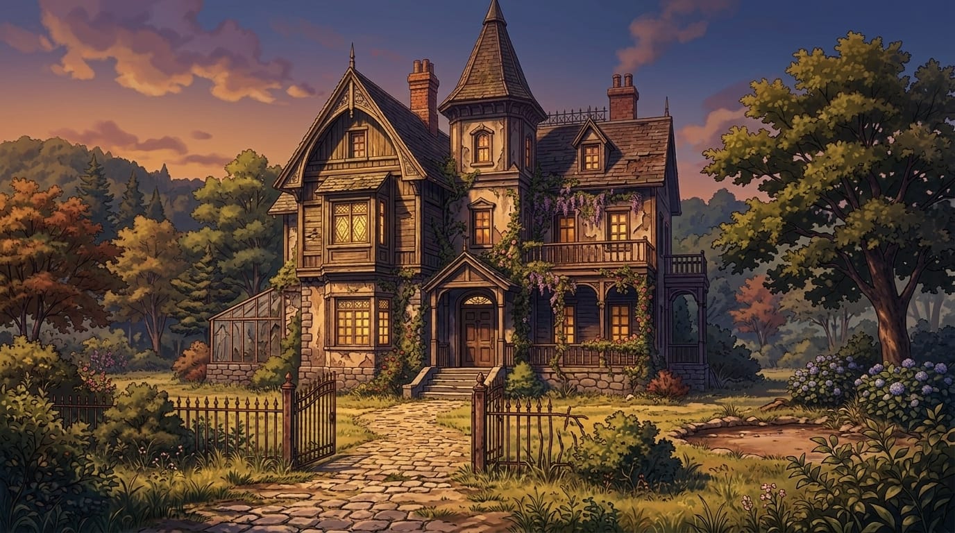 夕暮れの古びた洋館と門扉のある庭園風景|背景イラスト素材