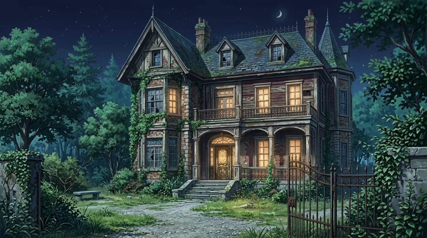 窓明かりが印象的な夜の古びた洋館を描いた背景イラスト素材で、幻想的で静かな夜景背景として活用できます。