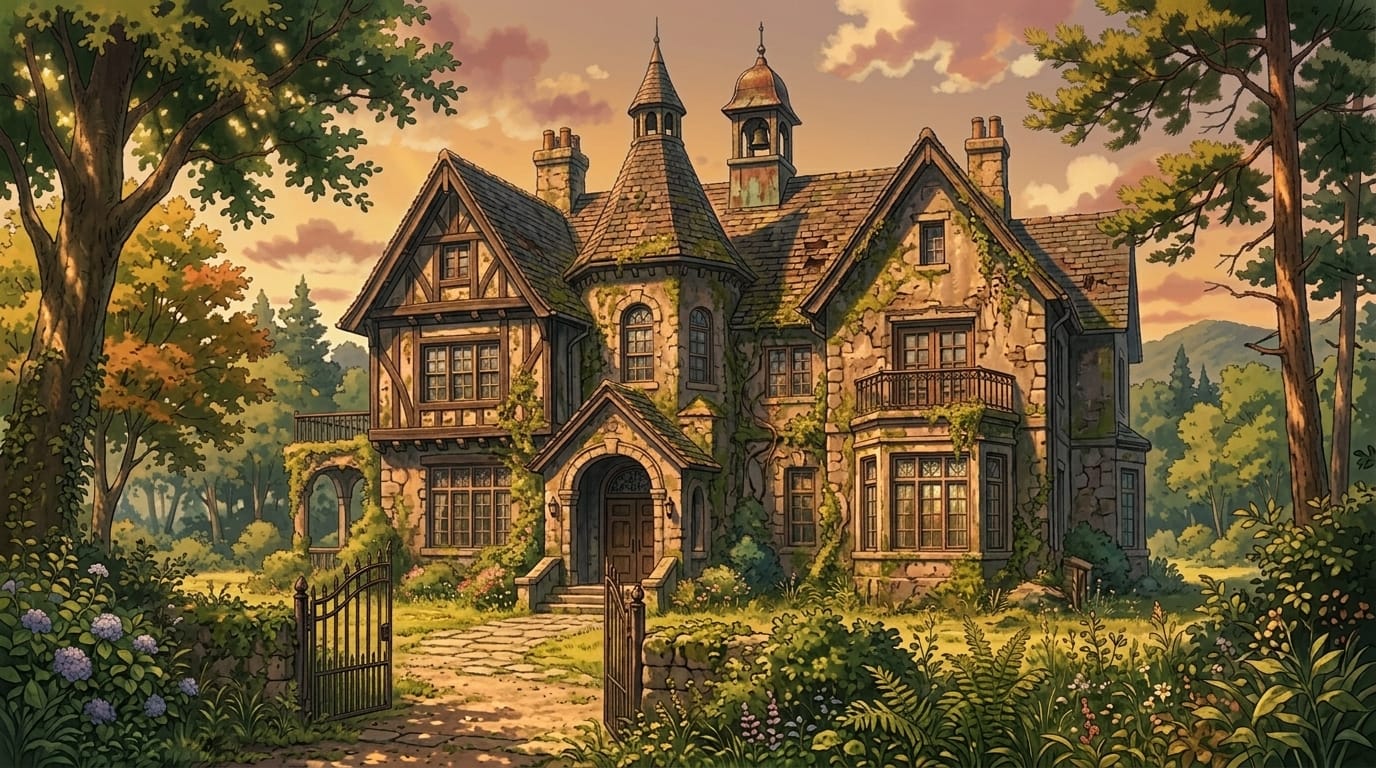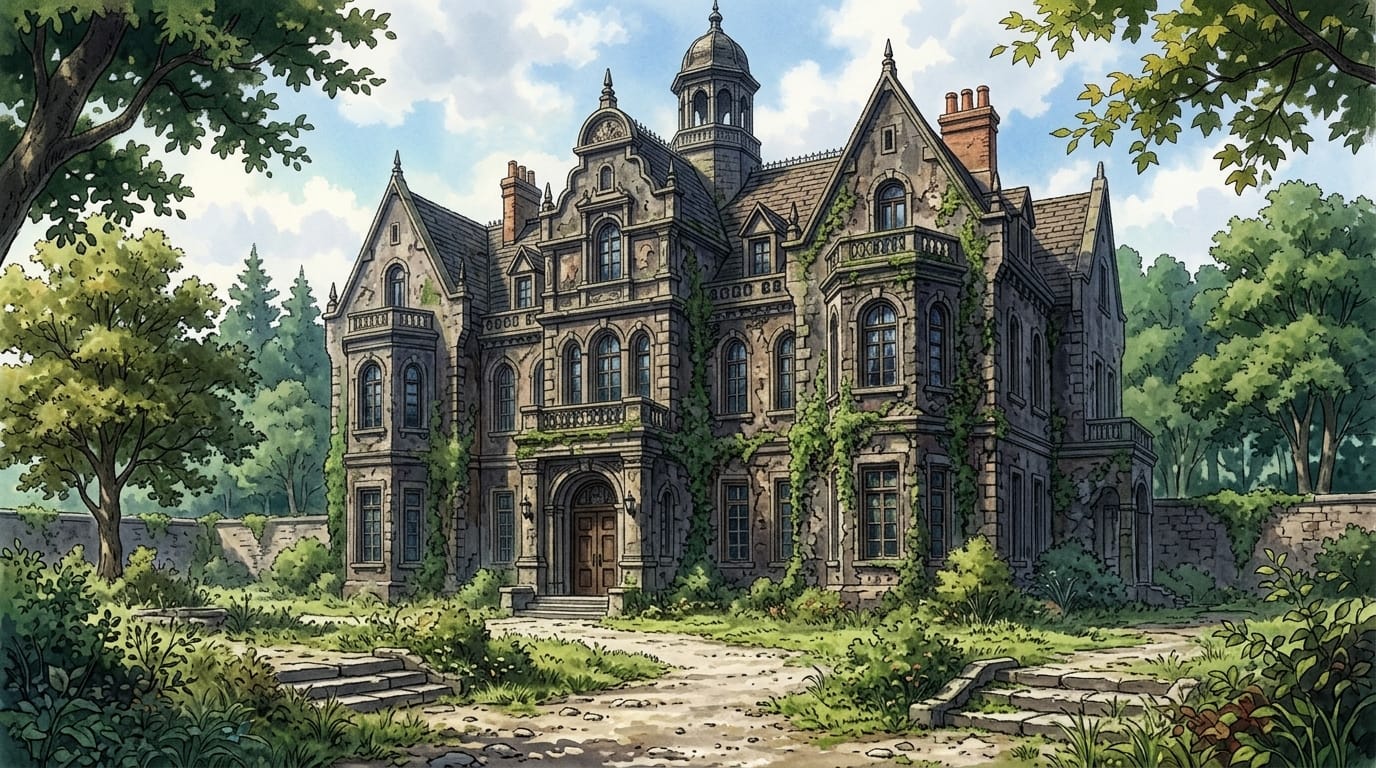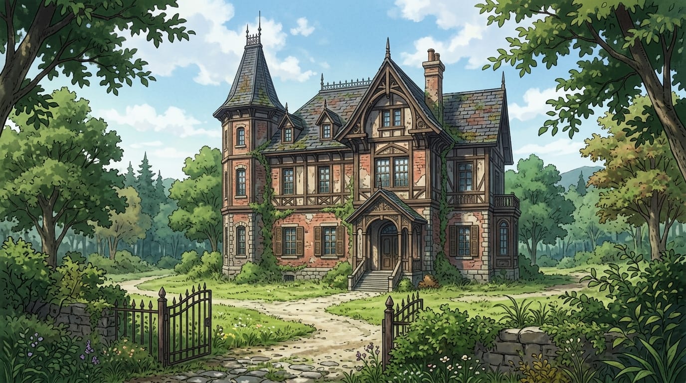 レンガ壁と塔が特徴的な古びた洋館を自然豊かな庭とともに描いた背景イラスト素材で、洋風邸宅の舞台設定に適しています。