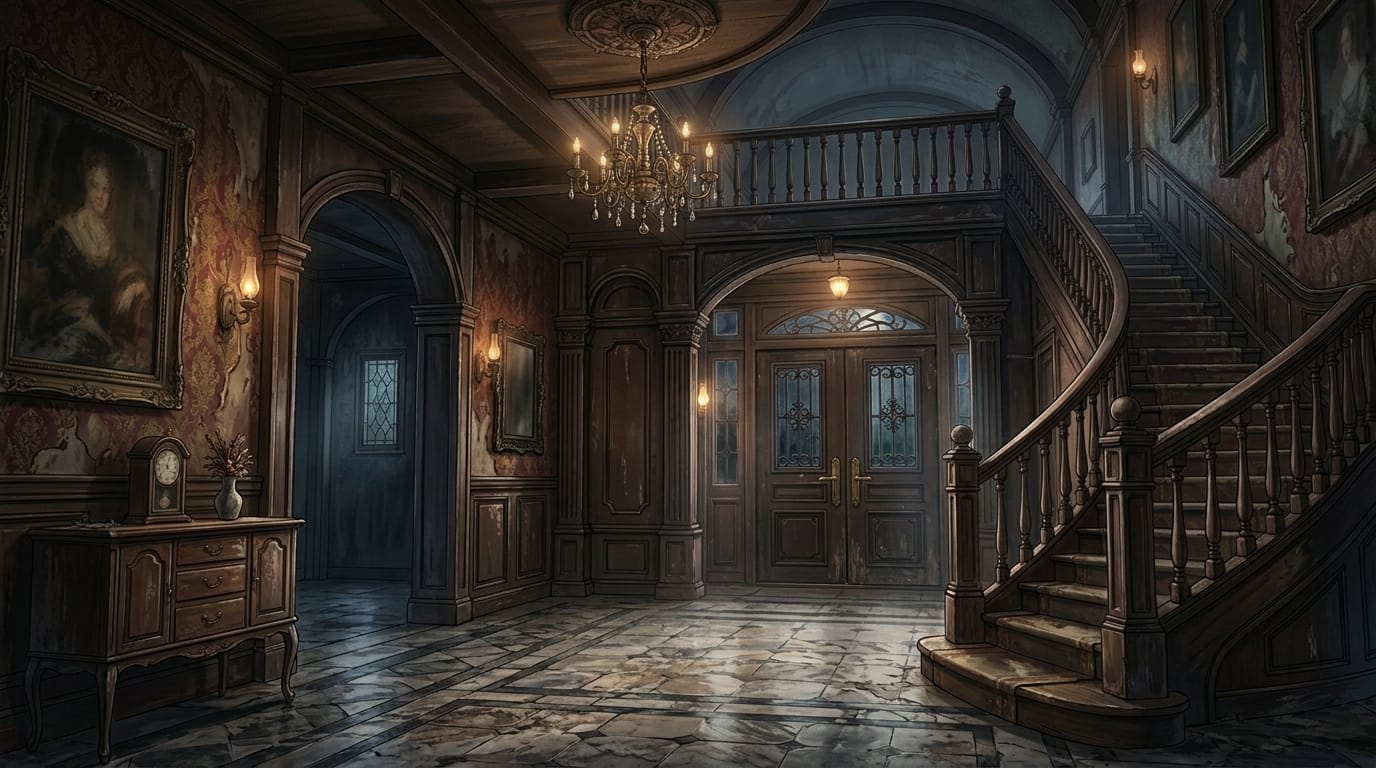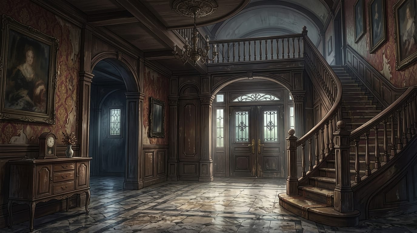 夜の静けさに包まれた古びた洋館の玄関ホール|背景イラスト素材