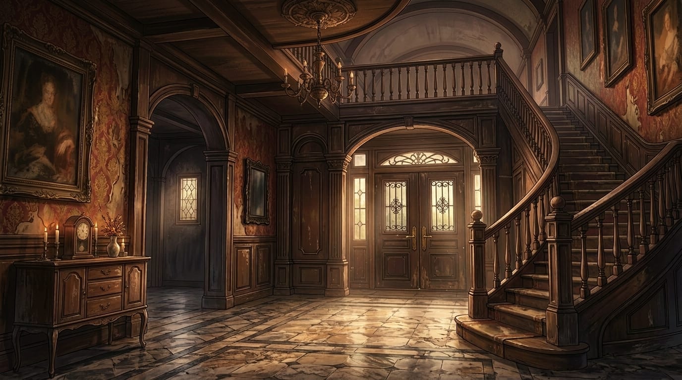 クラシックな調度品と大階段が印象的な洋館の玄関ホールを描いた背景イラスト素材で、館内シーンやミステリアスな室内演出に最適です。