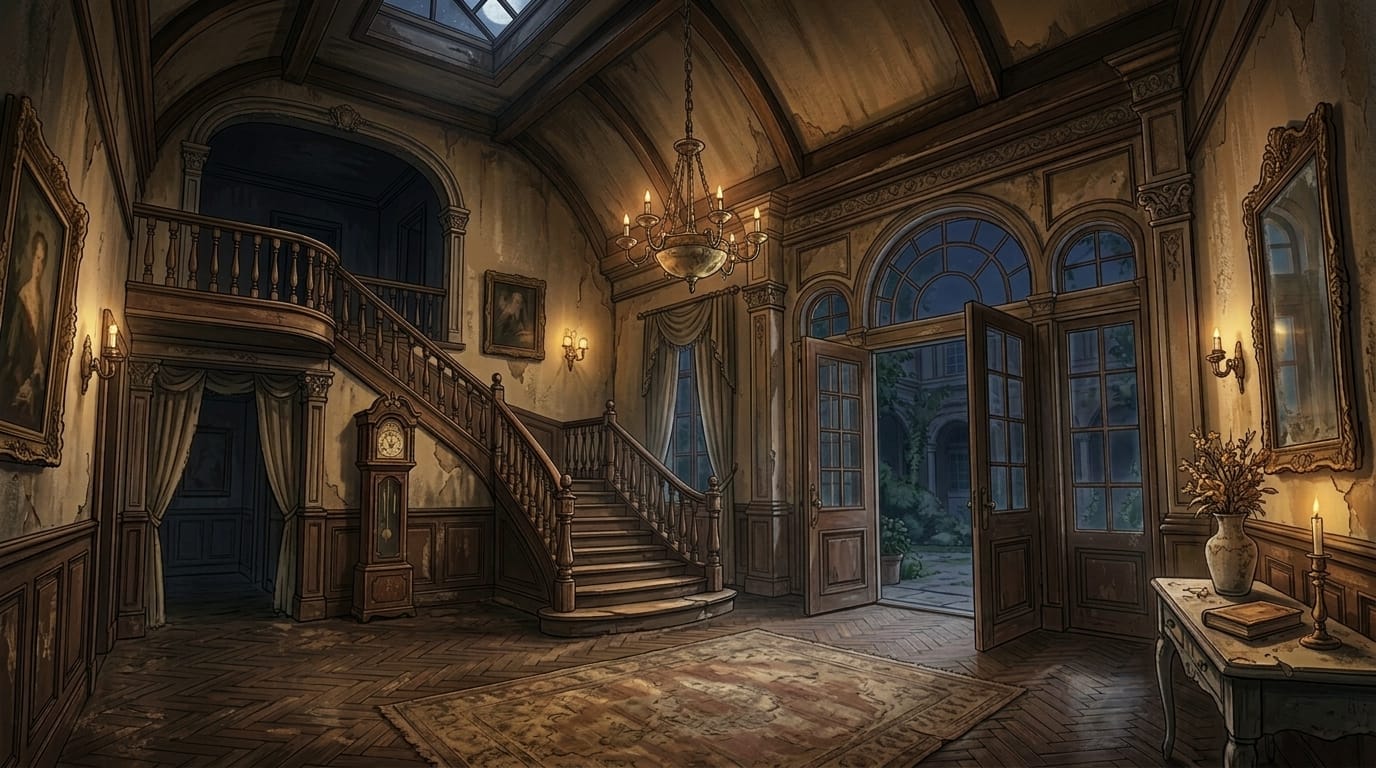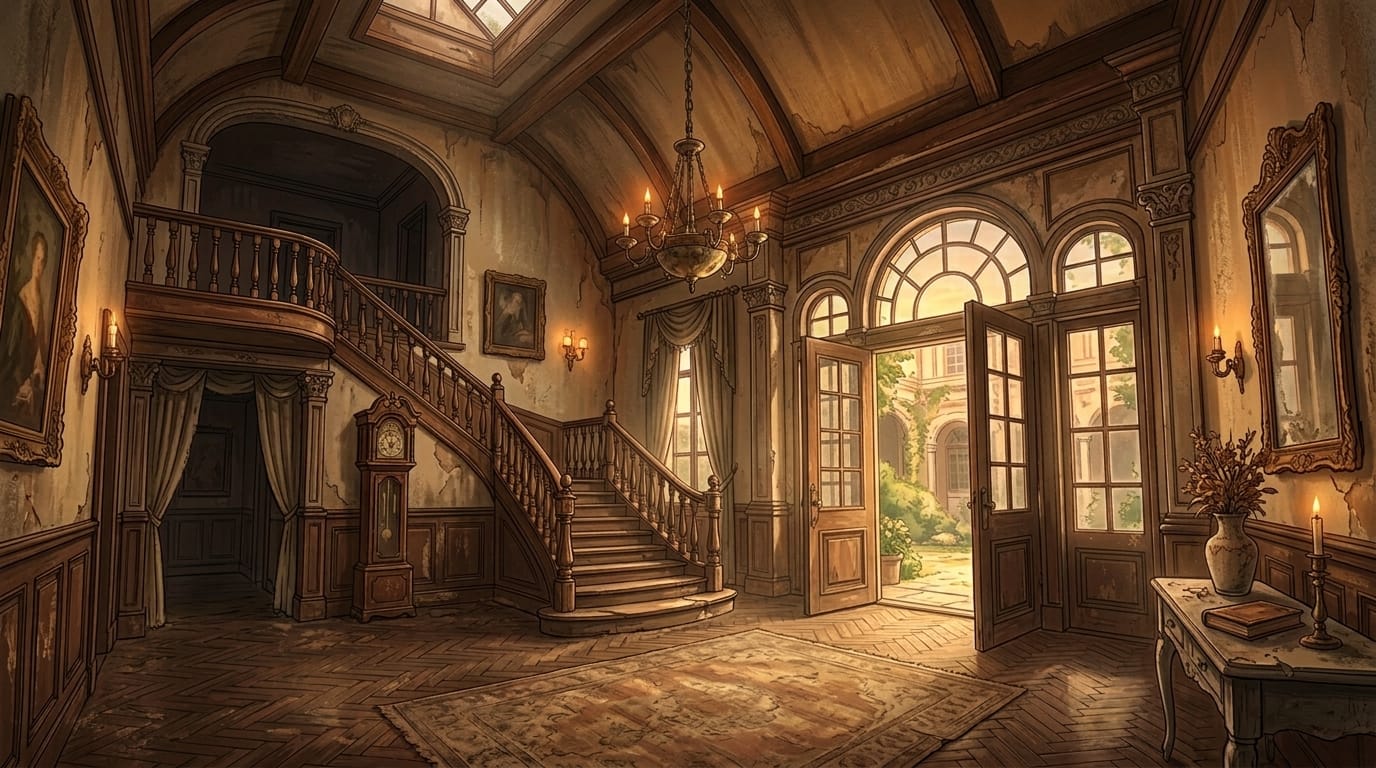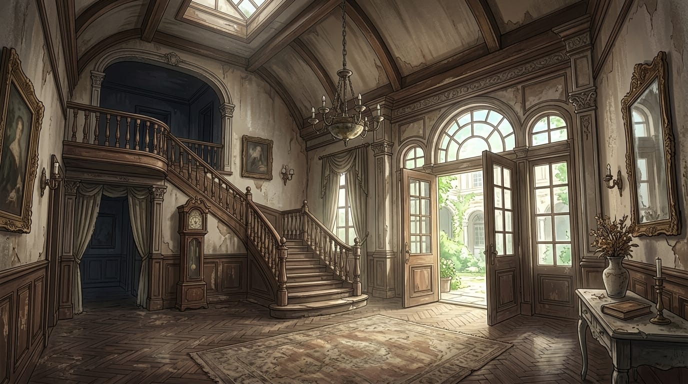 夕暮れの光が差し込む古びた洋館の玄関ホール|背景イラスト素材