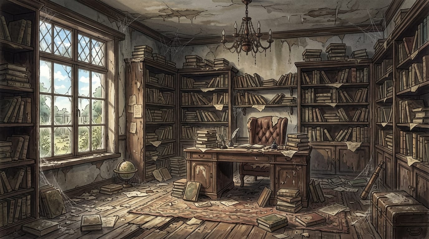 荒れた古びた洋館の書斎と本棚|背景イラスト素材