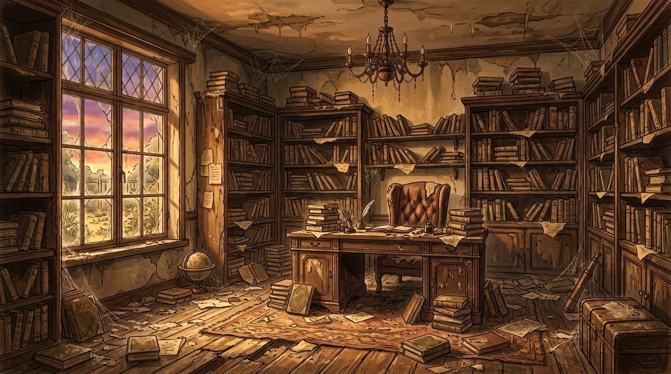 夕焼けが窓辺を染める古びた洋館の書斎を描いた背景イラスト素材で、物語性のある廃墟風インテリア背景として活用できます。