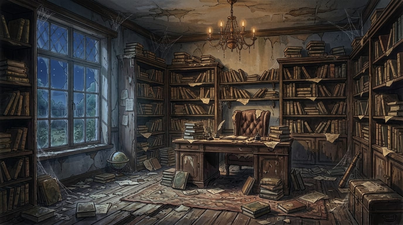 夜の古びた洋館にある廃れた書斎|背景イラスト素材