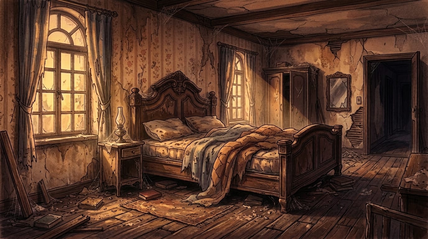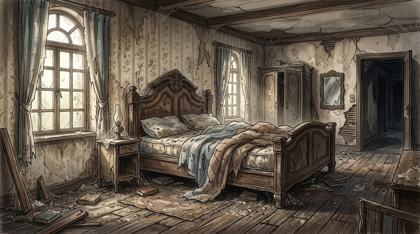 古びた洋館の荒れた寝室とアンティークベッド|背景イラスト素材