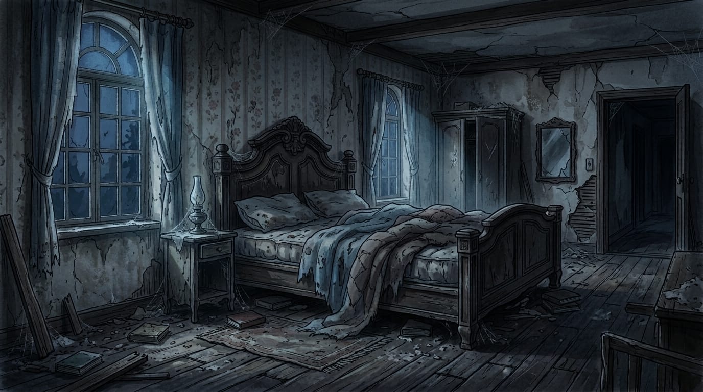 傷んだ壁や散らかった床、古いベッドが印象的な寝室を描いた背景イラスト素材で、ホラーや退廃的な洋館背景として使いやすいです。