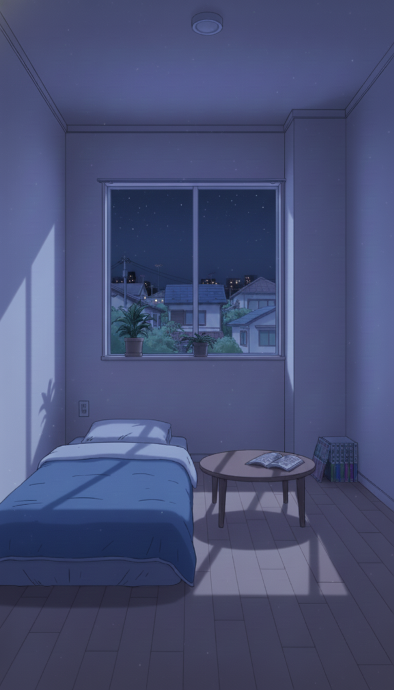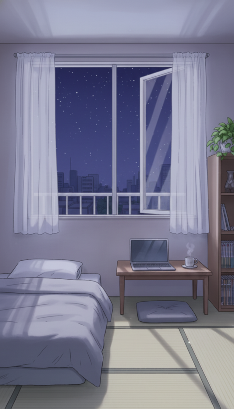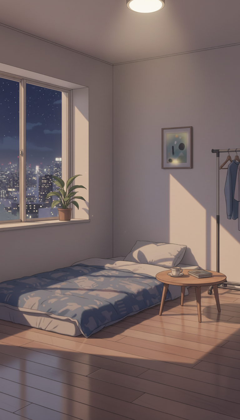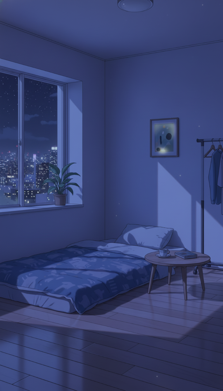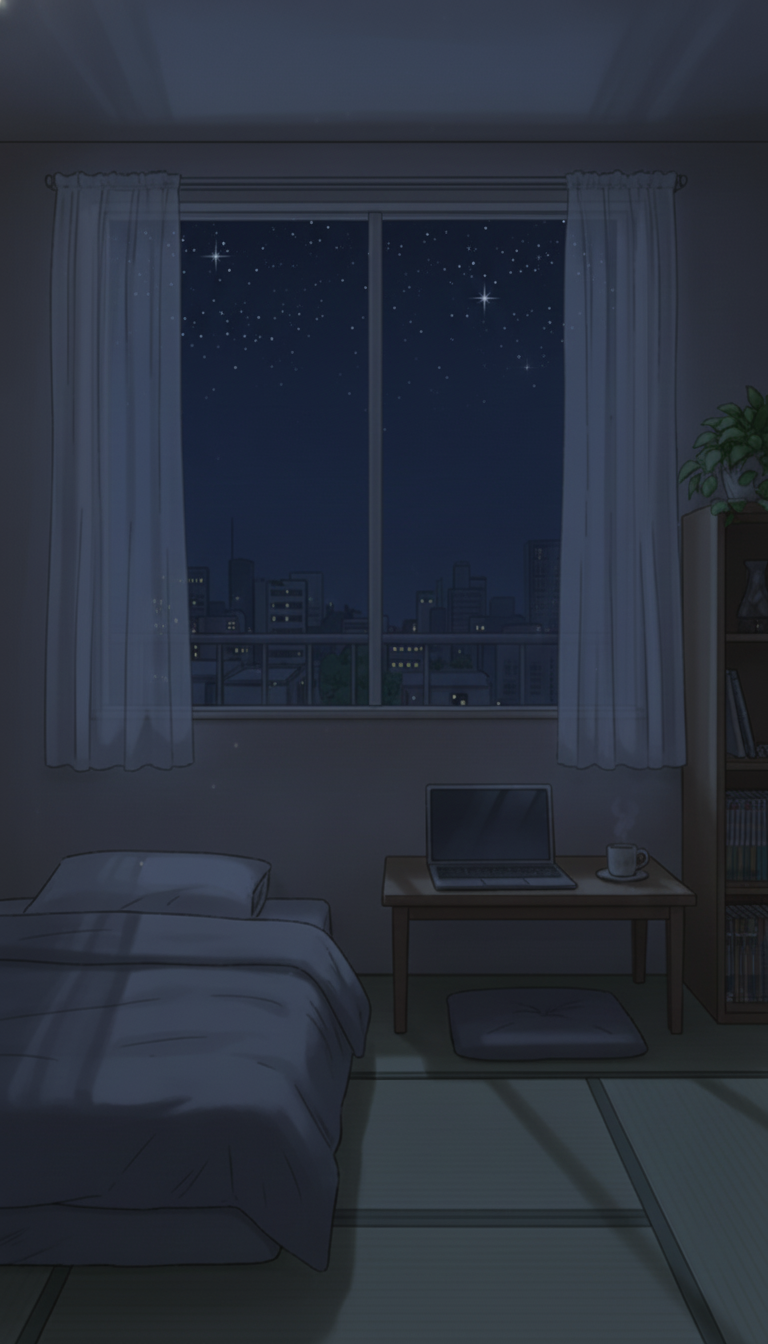 星空に照らされたミニマル布団寝室|深夜の一人暮らし部屋背景