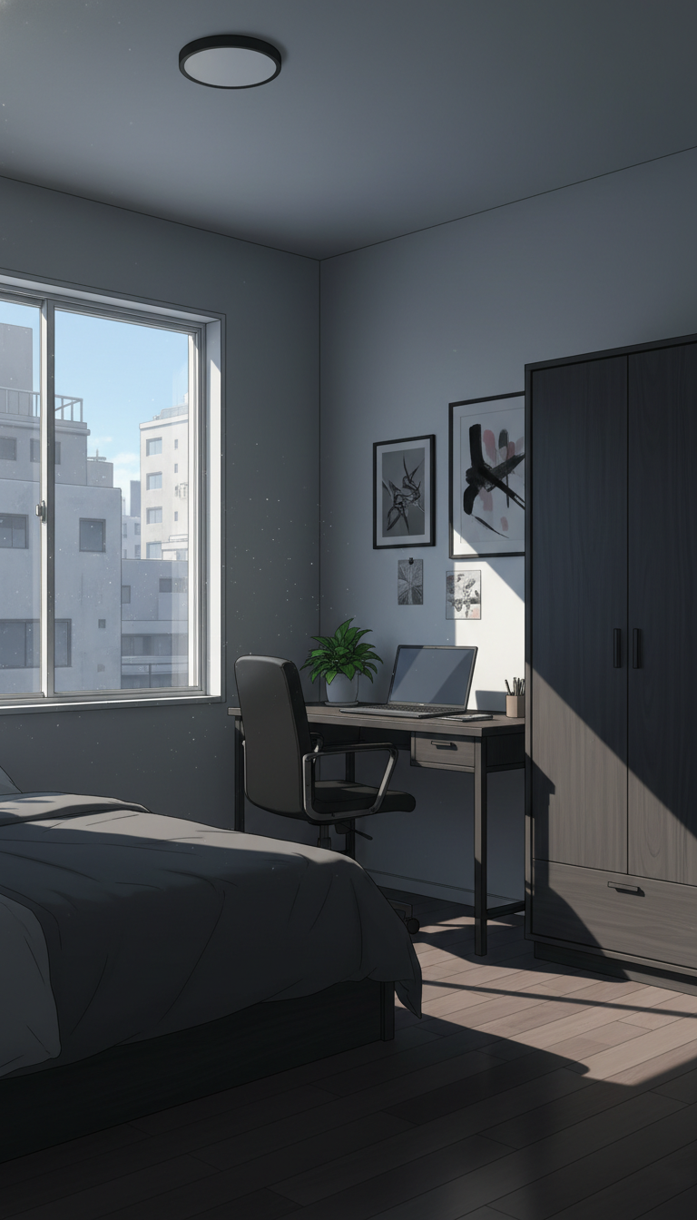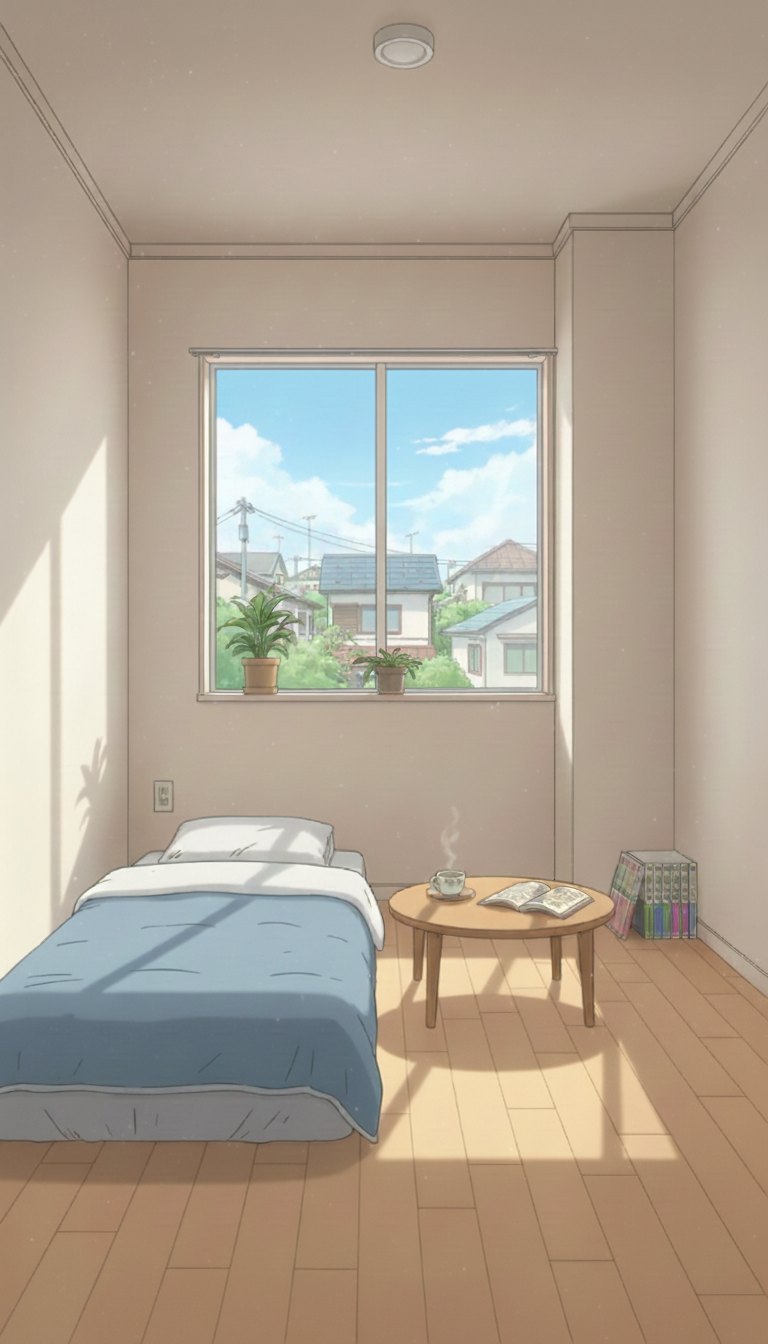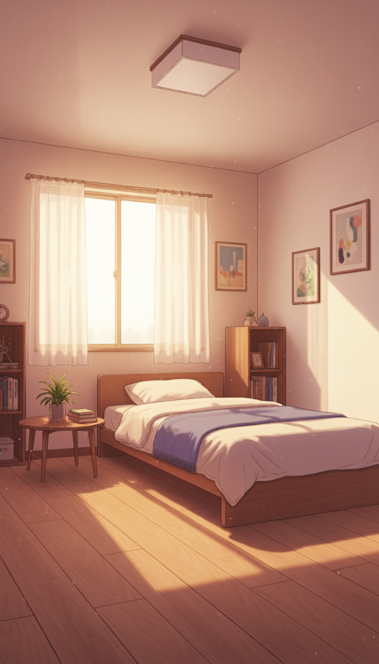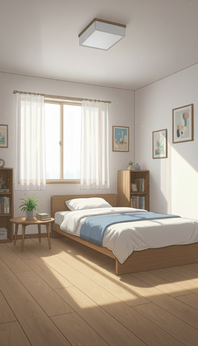 一人暮らしの寝室の背景イラスト素材を無料配布。9:16の縦長構図でスマホ作品に使いやすい背景イラストです。漫画・Webtoonやゲーム背景として商用・トレース利用もOK!