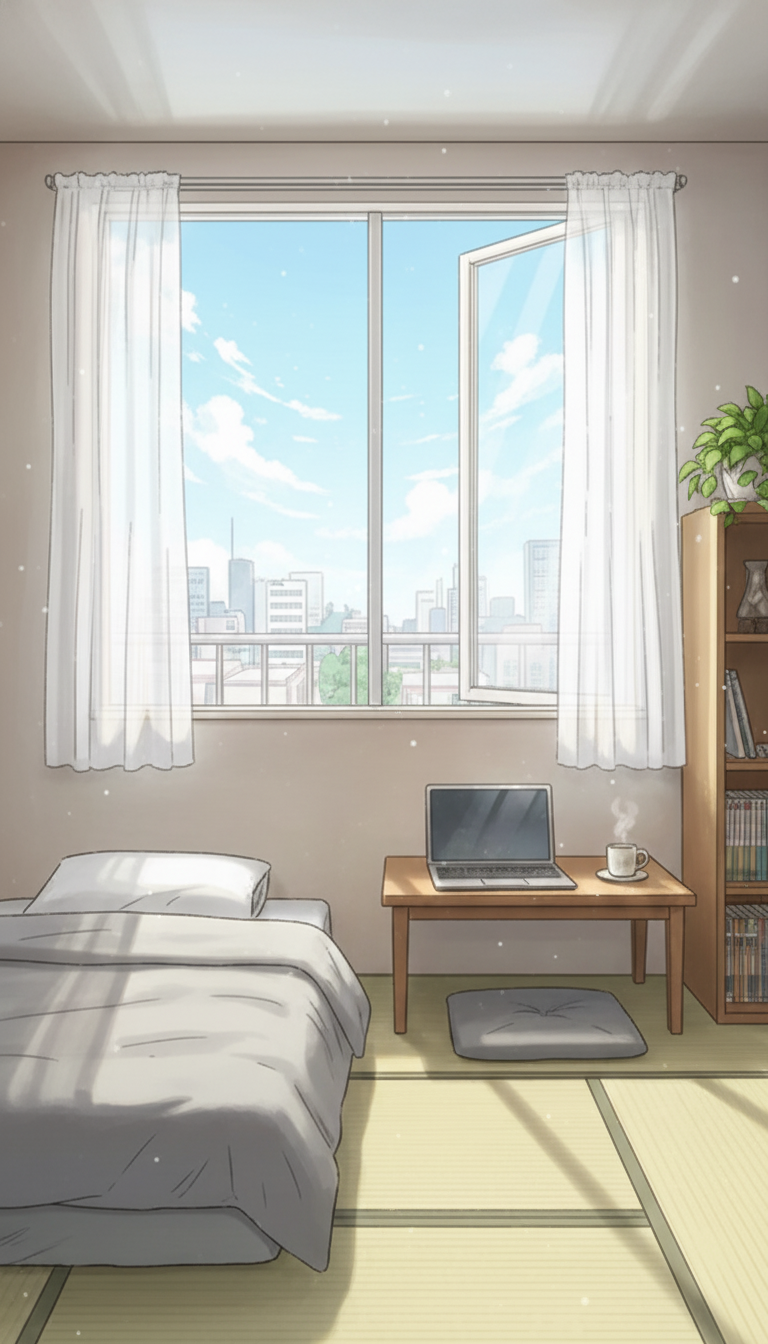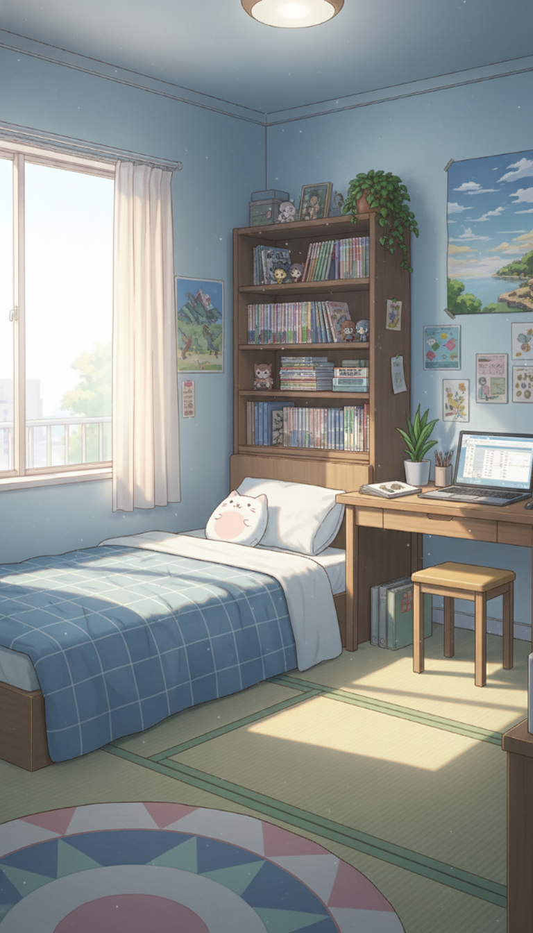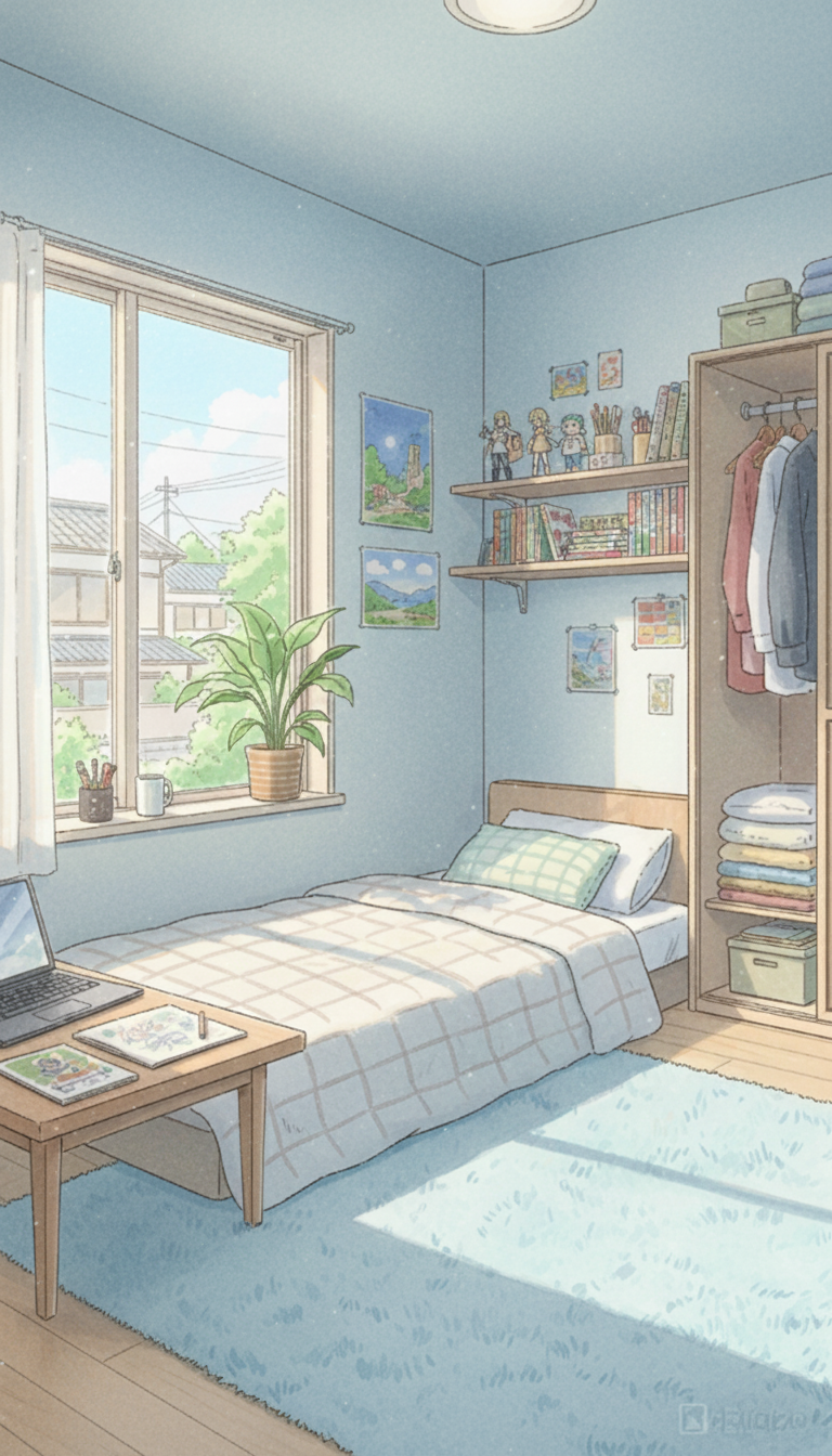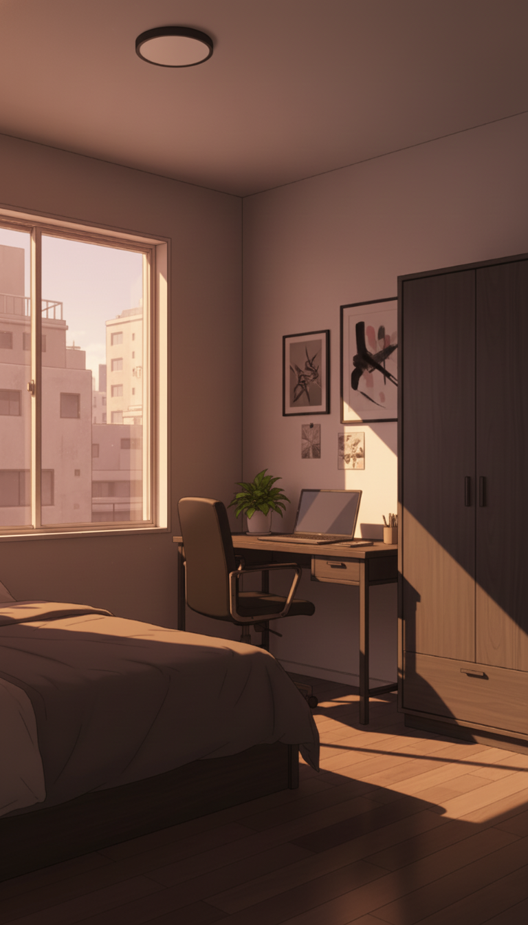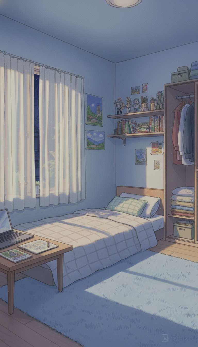 一人暮らしの寝室の背景イラスト素材を無料配布。9:16の縦長構図でスマホ作品に使いやすい背景イラストです。漫画・Webtoonやゲーム背景として商用・トレース利用もOK!