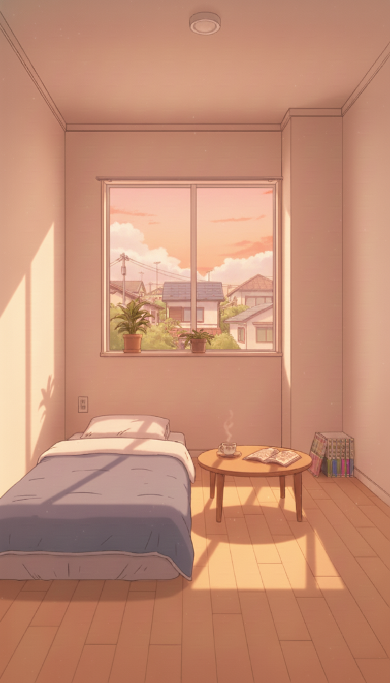 夕焼けに染まるワンルーム洋室ベッドルーム|ひとり時間リラックス背景