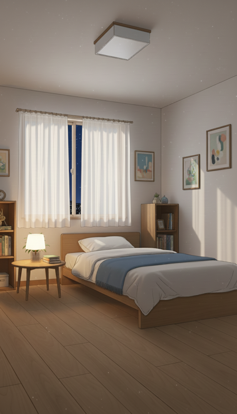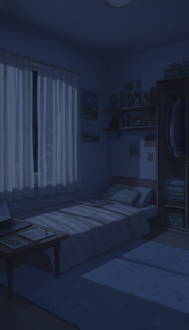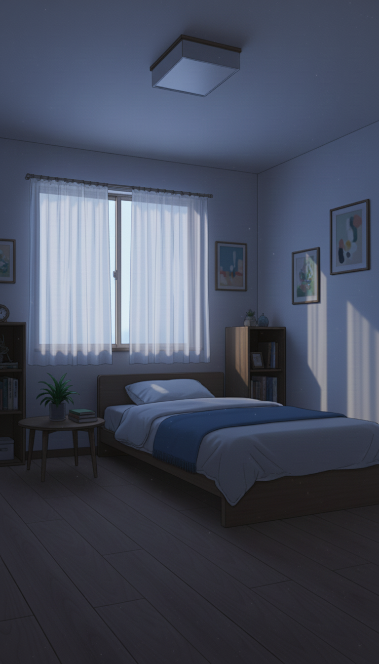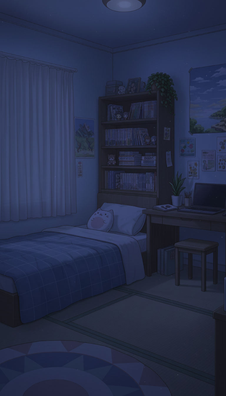 深夜の趣味部屋ベッドルーム|睡眠シーン向けナイト背景