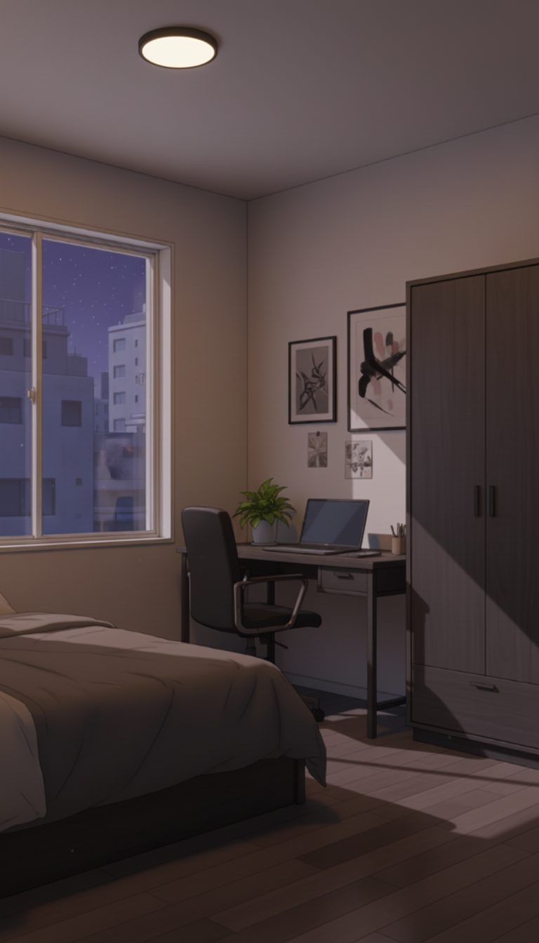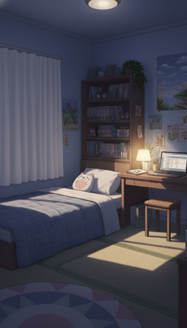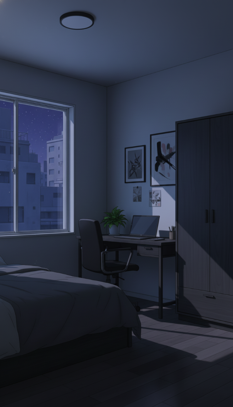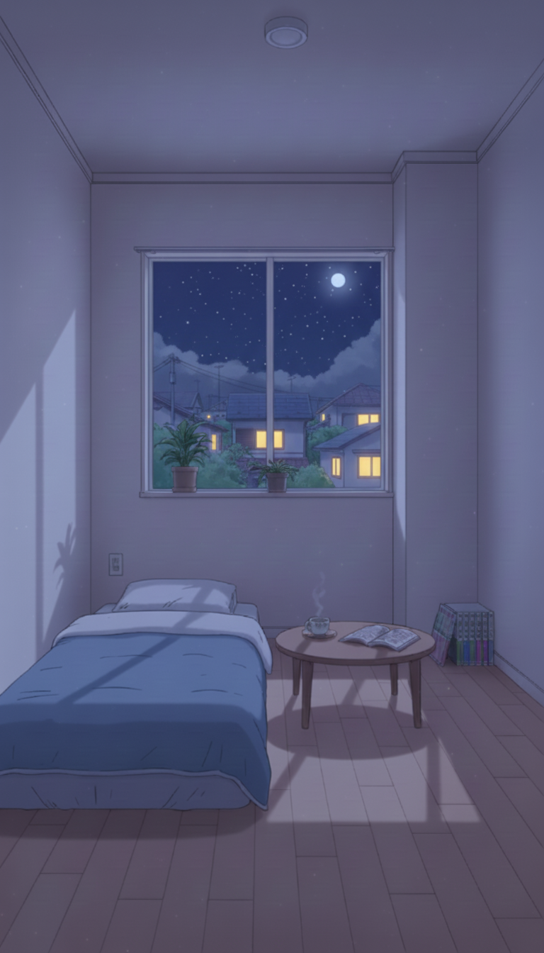 深夜の趣味部屋ベッドルーム|睡眠シーン向けナイト背景