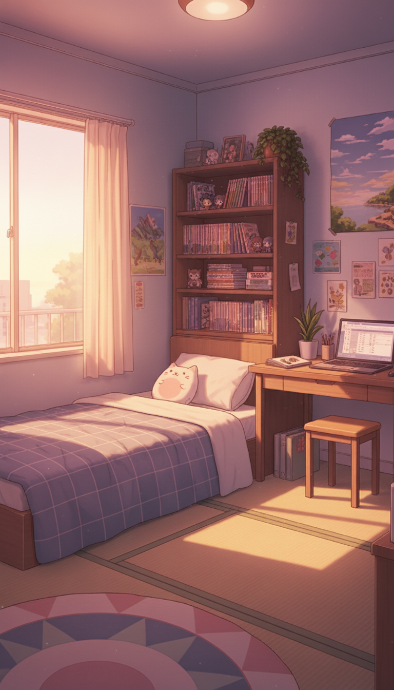 夕焼けに染まる趣味部屋ベッドルーム|黄昏のコレクターズルーム背景