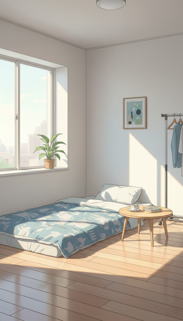 床に敷いた布団と小さな丸テーブル、観葉植物がそろったシンプルなワンルームで、節約一人暮らしの朝を描ける背景です。