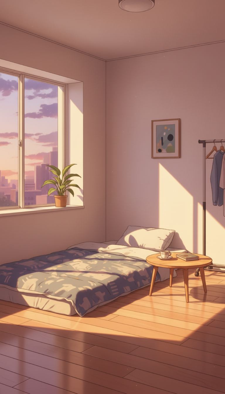 窓の外の夕焼けと長く伸びる影が、布団とローテーブルだけのミニマルな部屋にあたたかさをプラスする夕方シーン背景です。