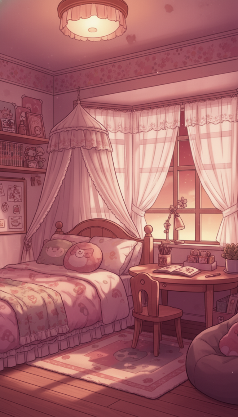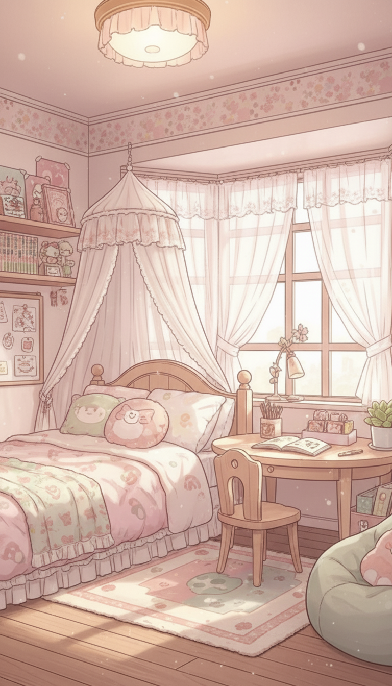 レースの天蓋ベッドと丸テーブル、ぬいぐるみや小物が並ぶ甘い配色で、女の子の夢かわいい寝室シーンに最適な背景です。