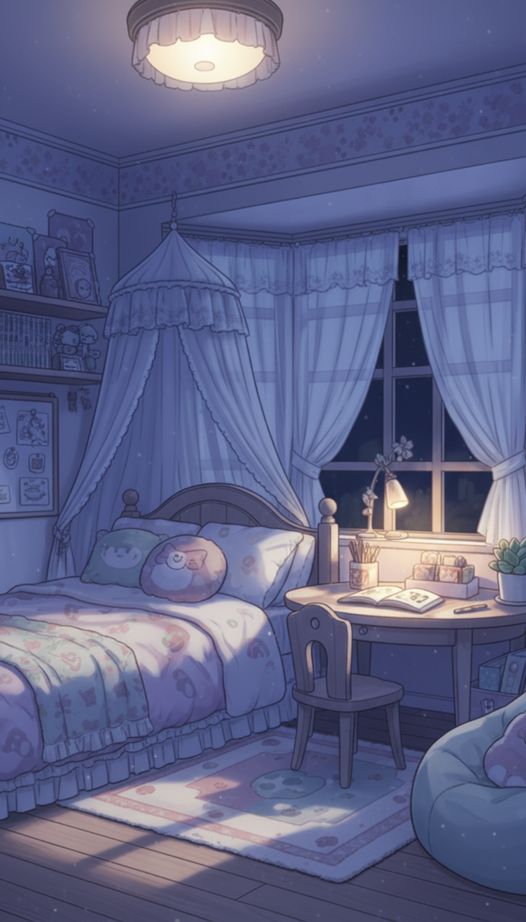 天蓋付きベッドとレースカーテン、デスクライトに照らされた机がそろい、就寝前の勉強や日記タイムを描きたいときに最適な夜の背景です。