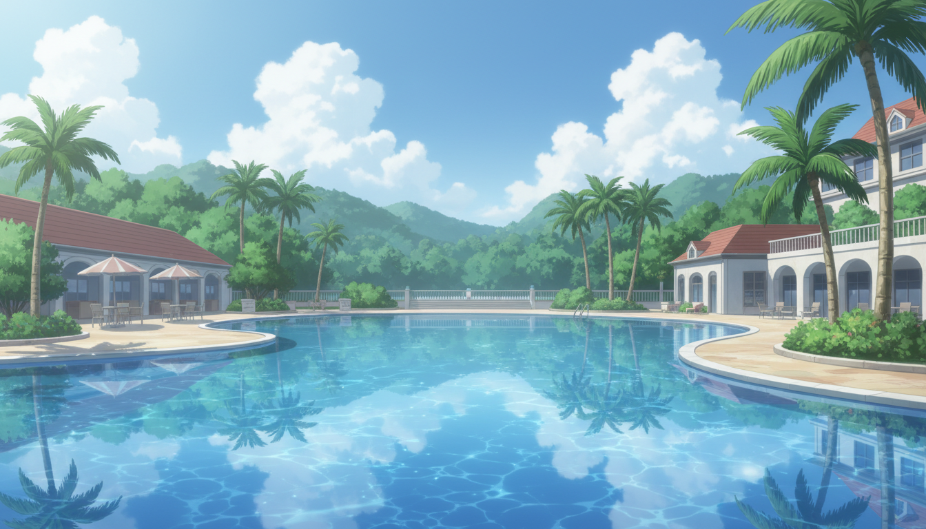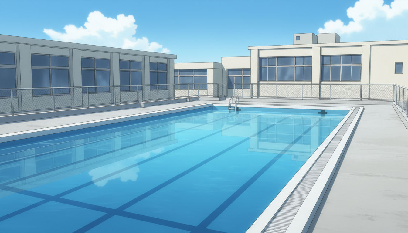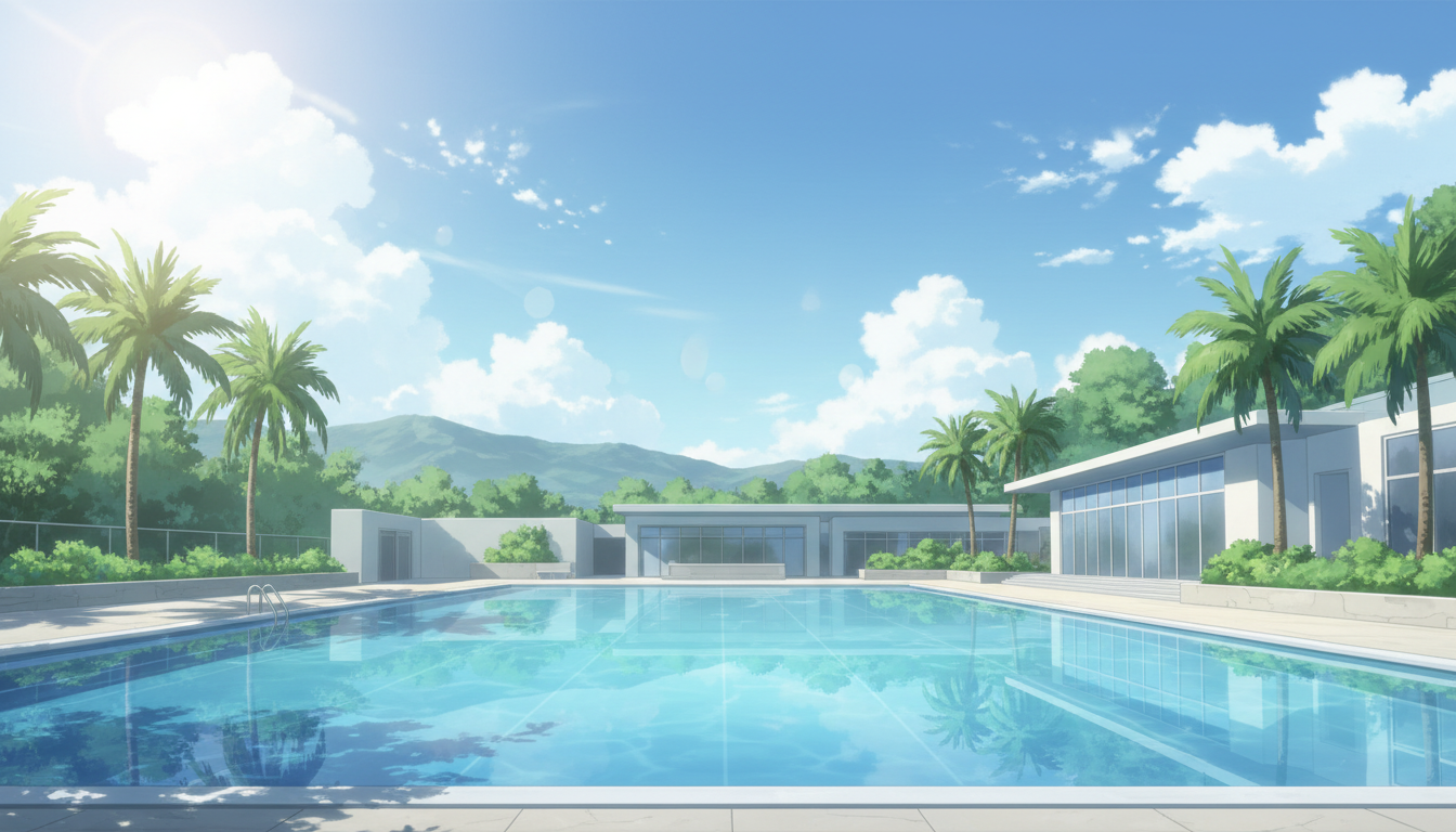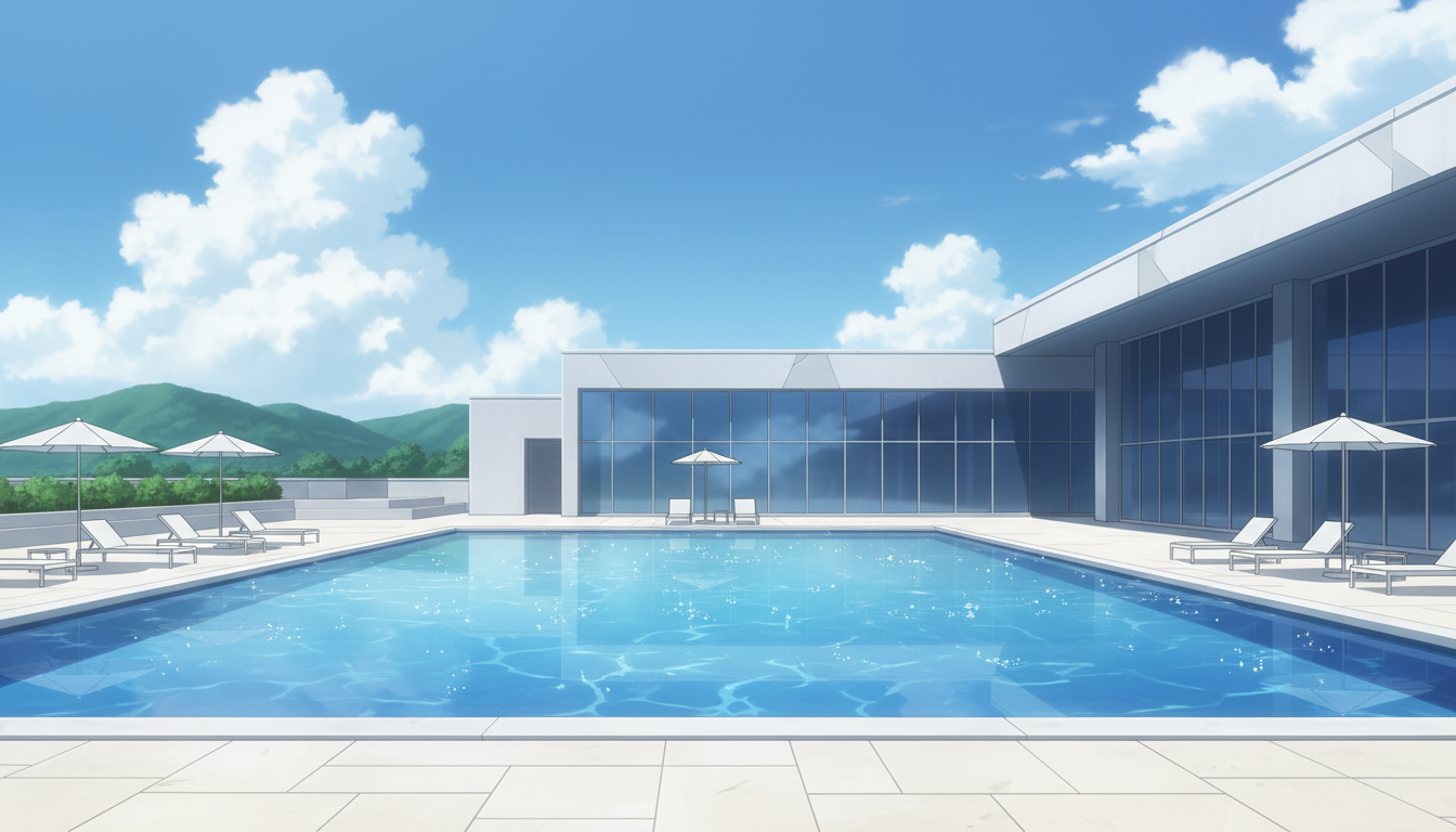 プールの背景イラスト素材を無料配布。16:9の横長構図でPC向け作品に使いやすい背景イラストです。漫画・Webtoonやゲーム背景として商用・トレース利用もOK!