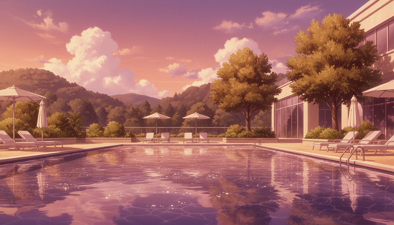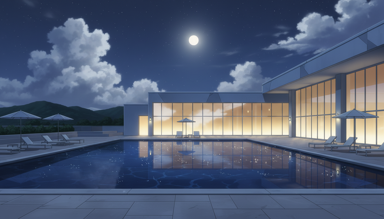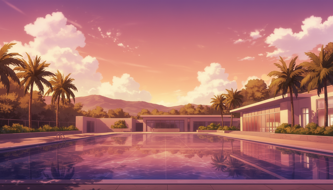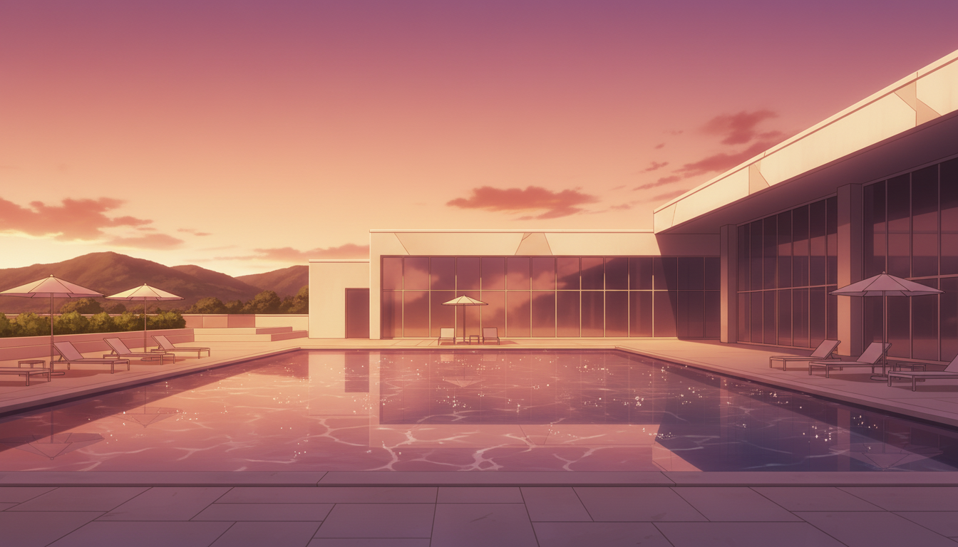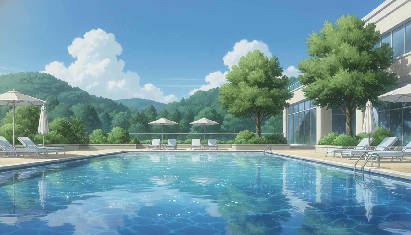 プールの背景イラスト素材を無料配布。16:9の横長構図でPC向け作品に使いやすい背景イラストです。漫画・Webtoonやゲーム背景として商用・トレース利用もOK!