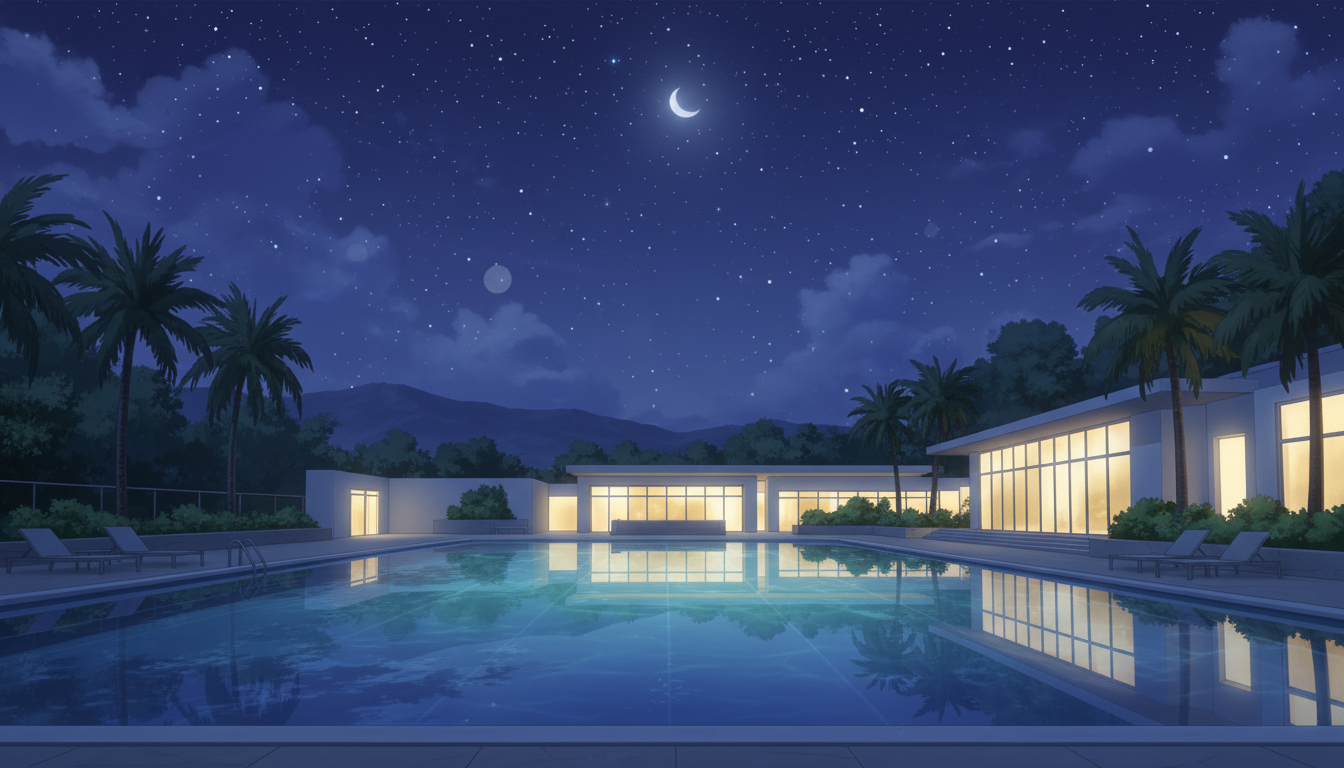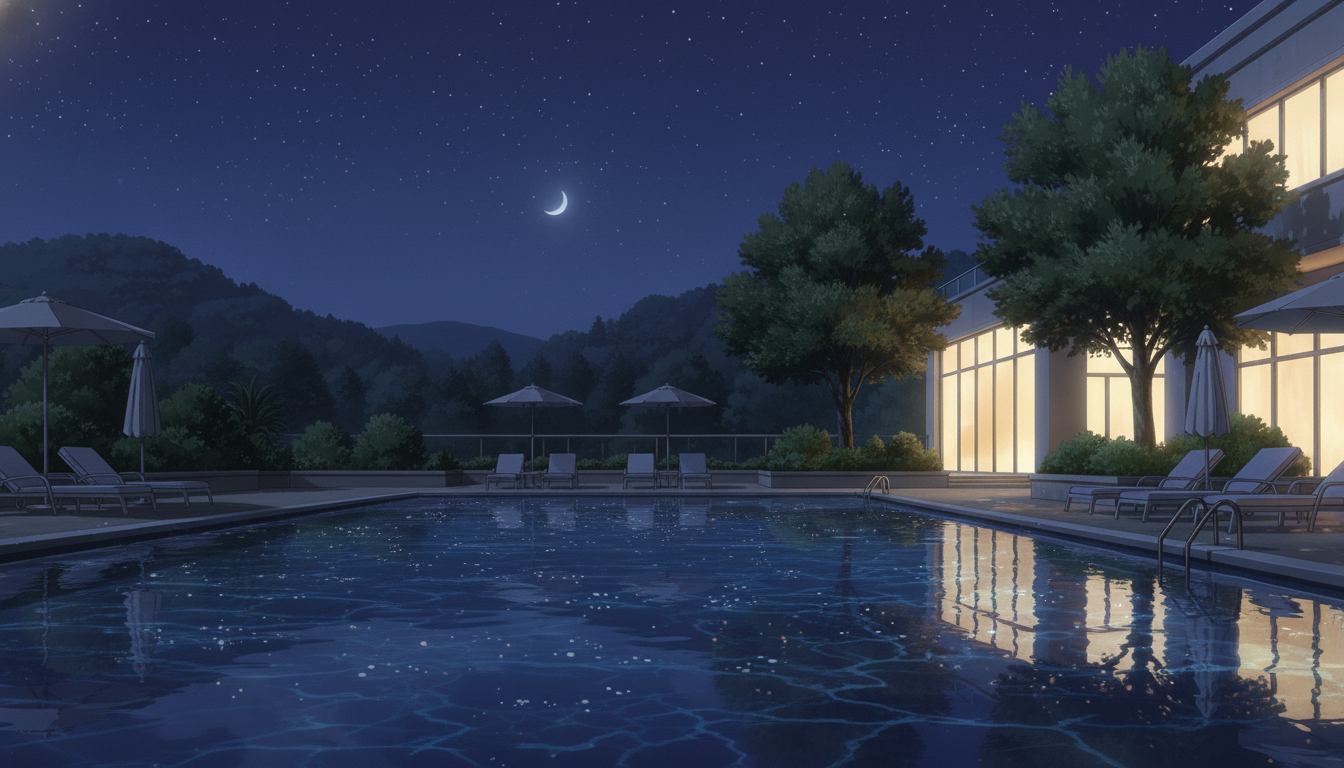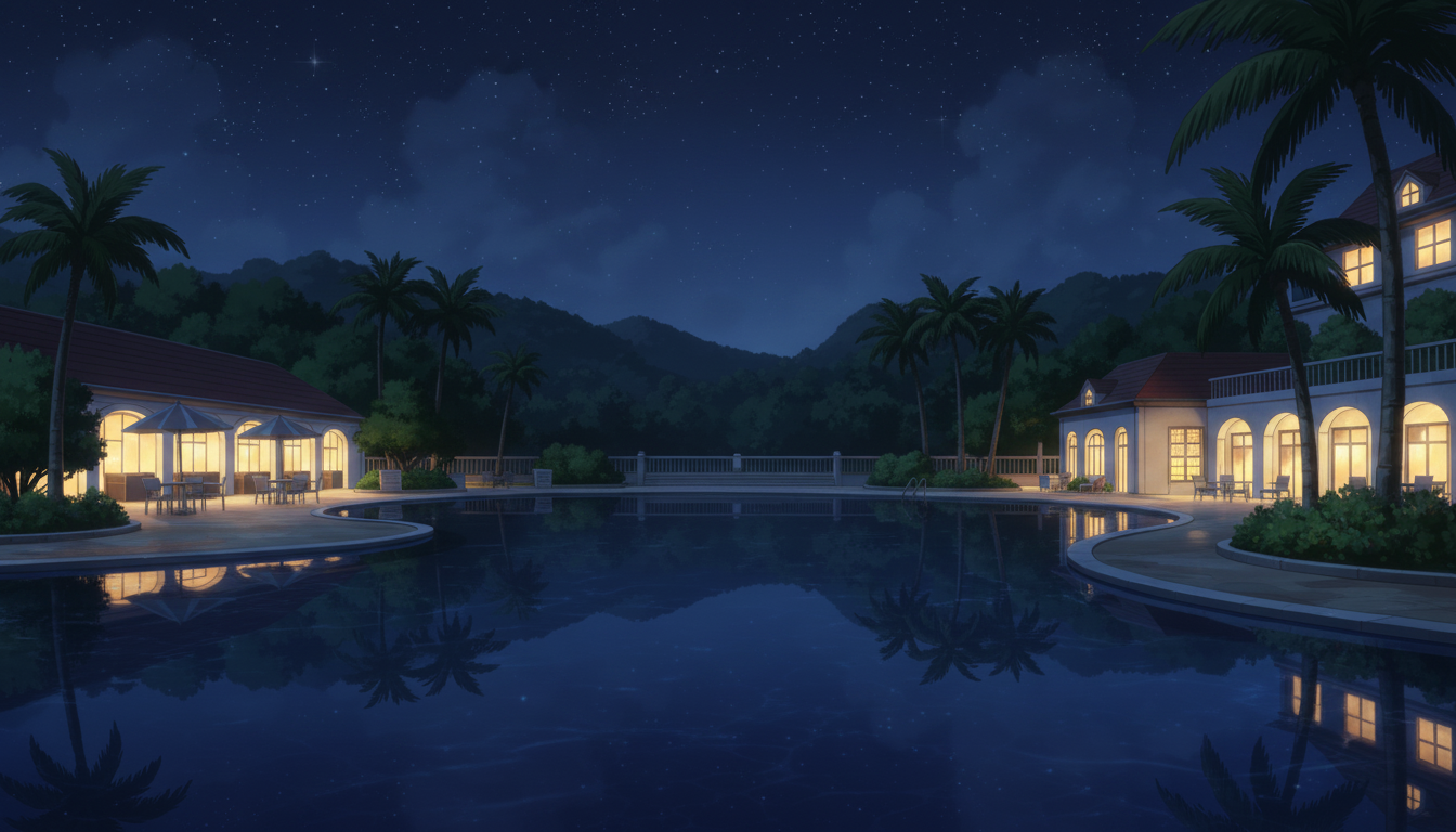 山あいの星空と暖かな建物の光が美しい、落ち着いた夜のプール背景です。
