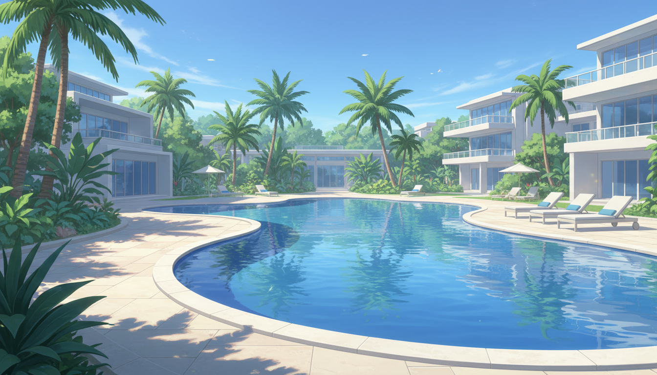 白いヴィラとヤシの木に囲まれた、開放感のある高級リゾートプールの背景イラストです。