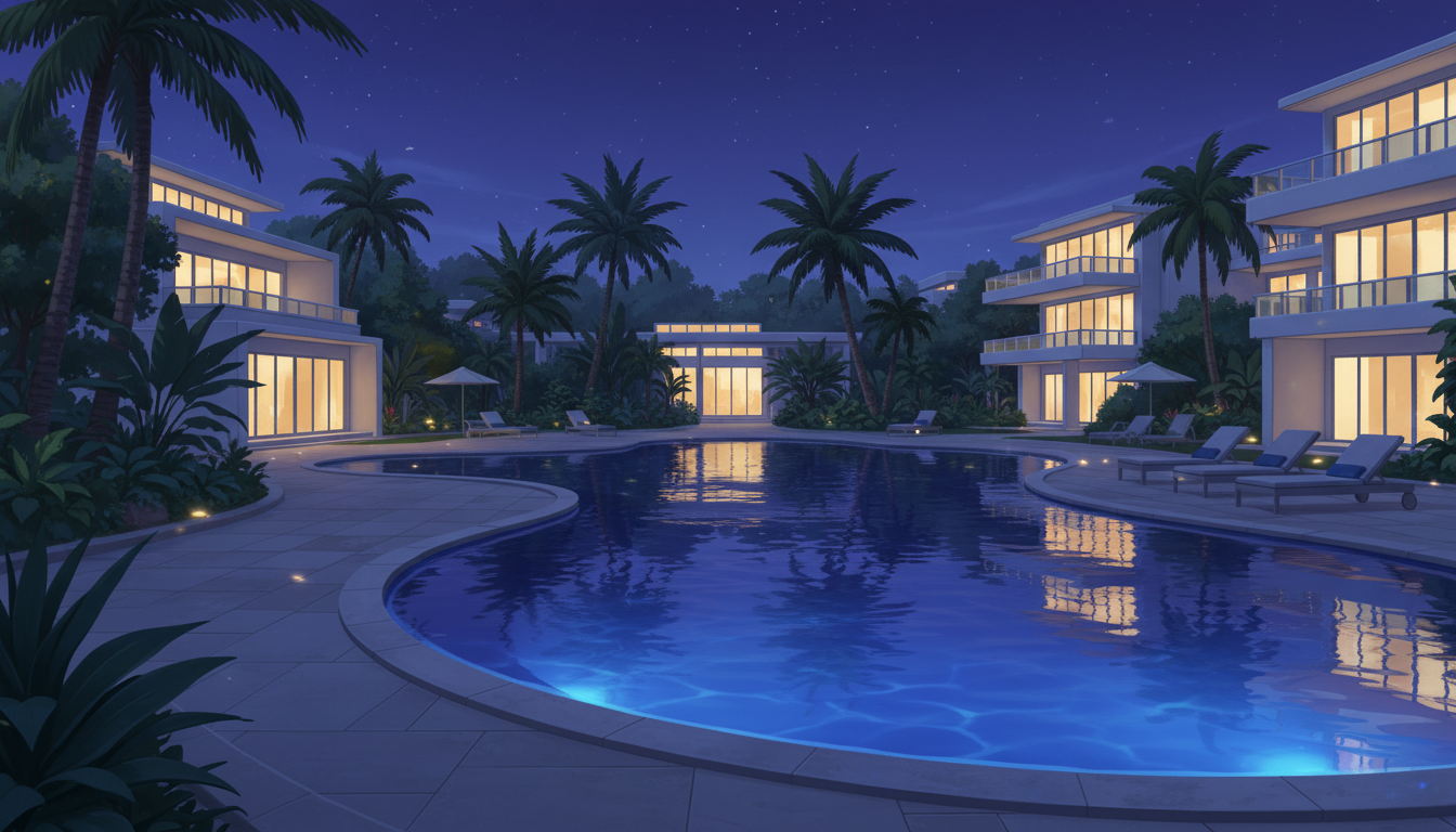 星空の下で建物の明かりが水面に映る、上質なナイトプールの背景イラストです。