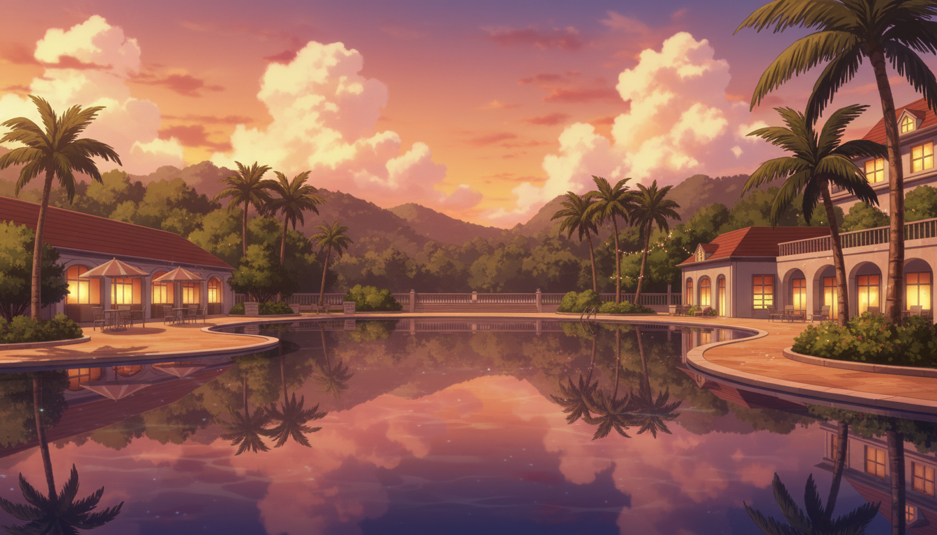 夕焼け空と山並み、穏やかな水面が調和した、落ち着いた雰囲気のリゾートプール背景です。
