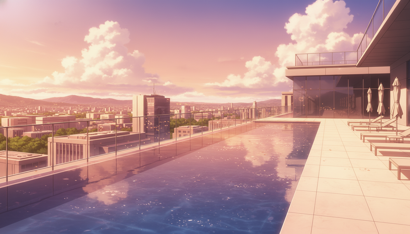 夕暮れの街並みと淡い空の色が美しい、都会的でおしゃれな屋上プール背景です。