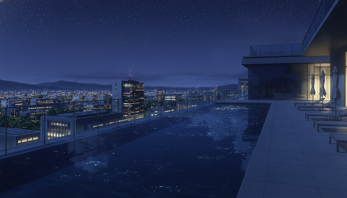 きらめく夜景と静かな水面が印象的な、ラグジュアリーな屋上ナイトプール背景です。