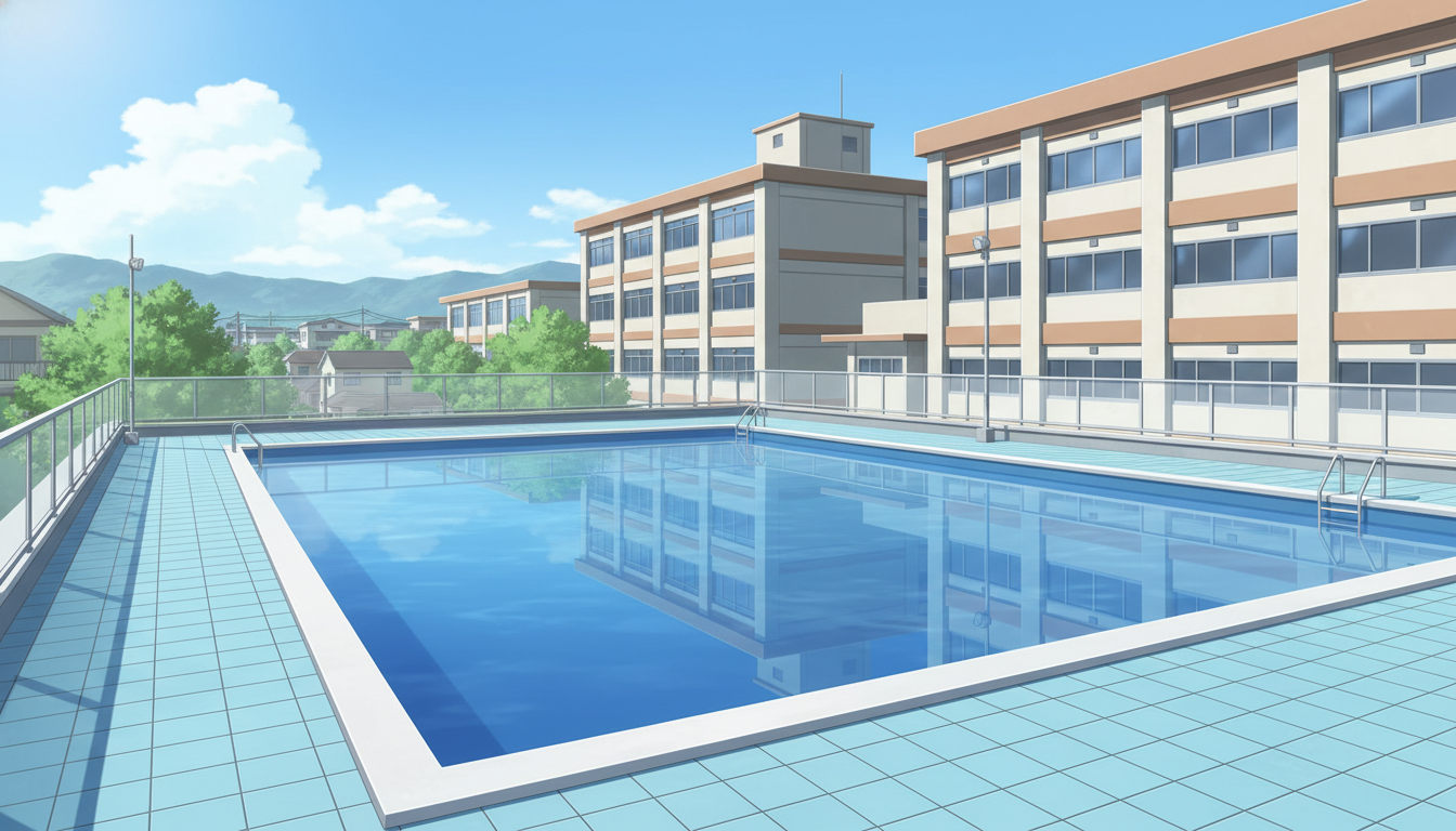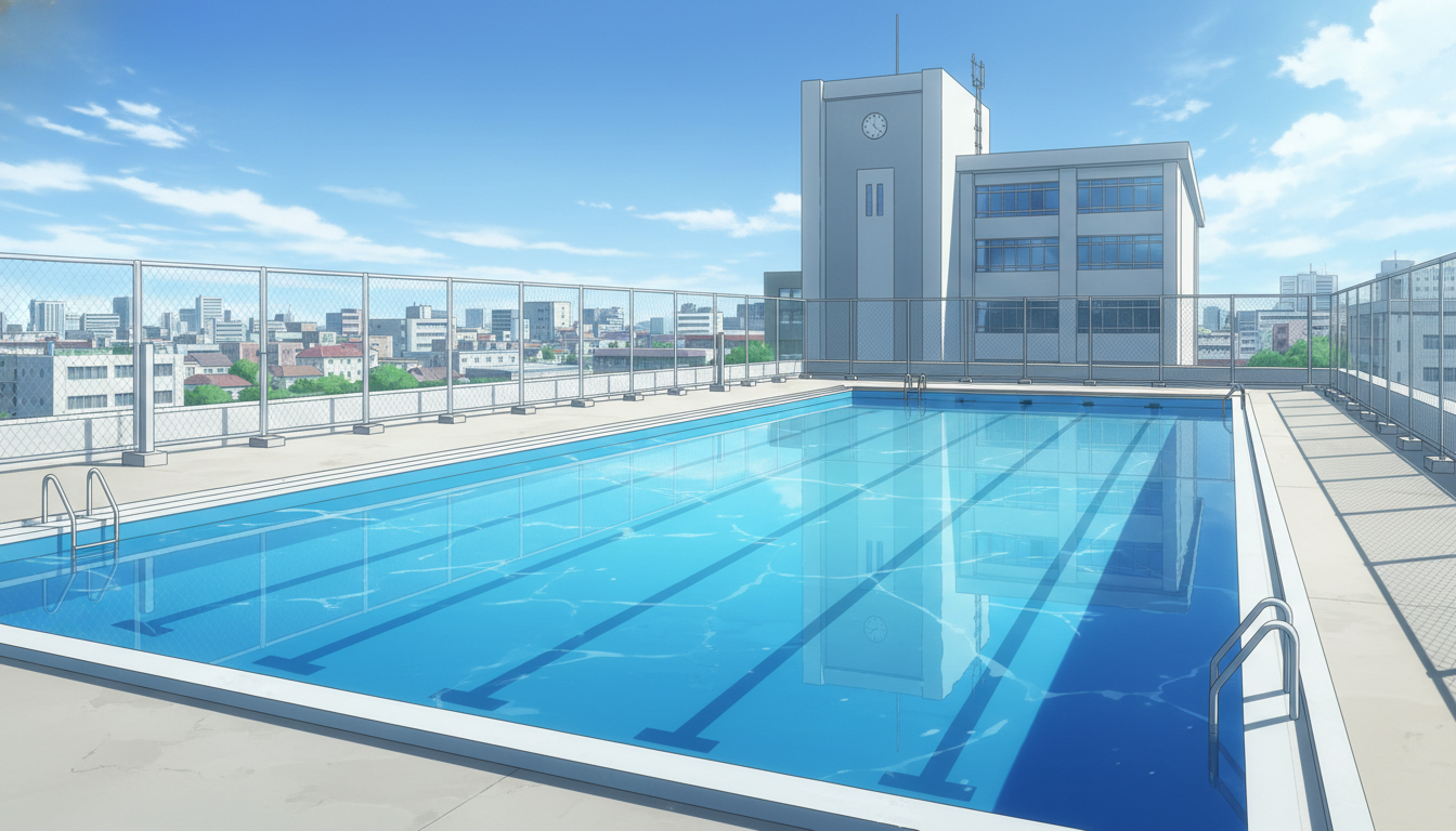 澄んだ青空と校舎に囲まれた爽やかな構図で、学校シーンに使いやすいプール背景です。