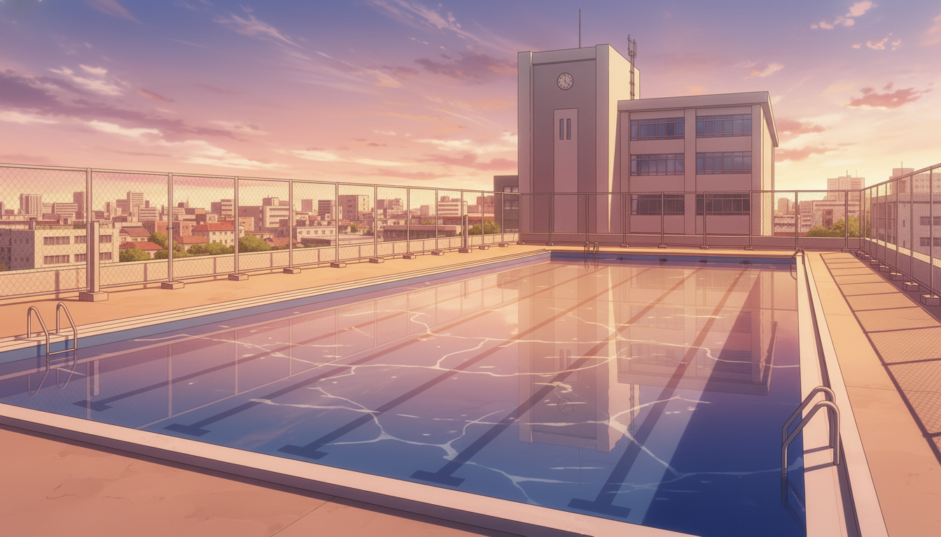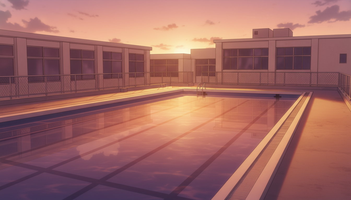 やわらかな夕焼け空と穏やかな水面が広がる、ノスタルジックな学校プール背景です。