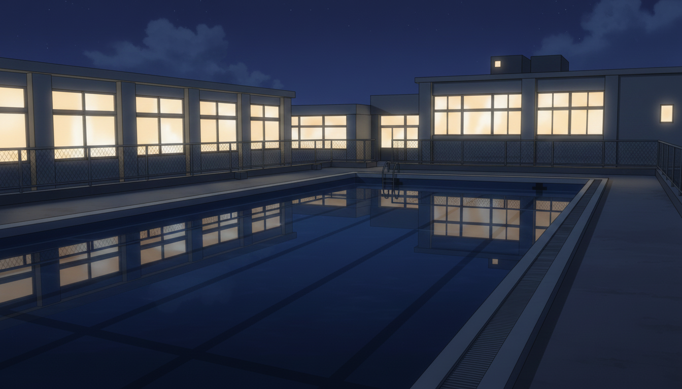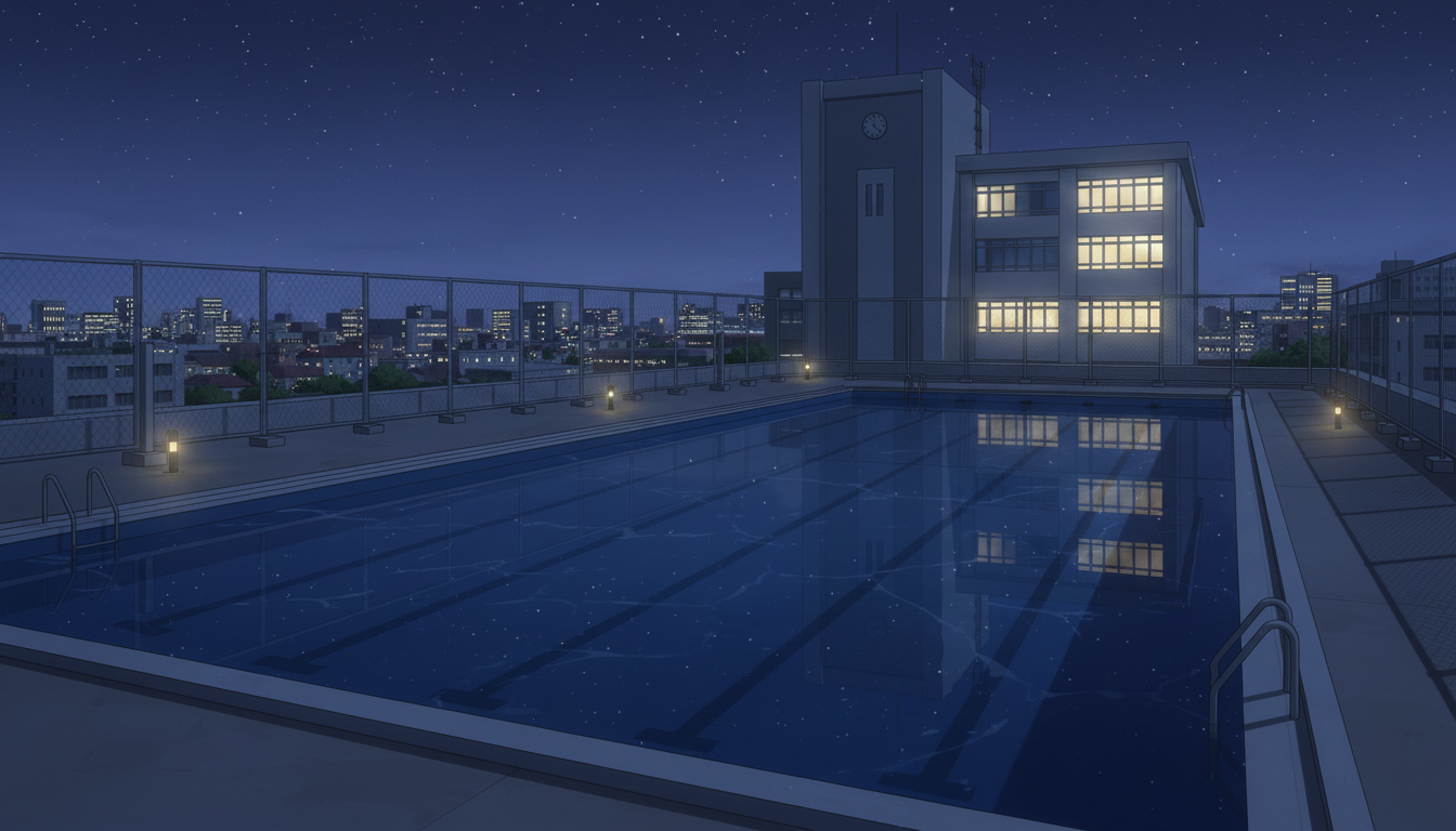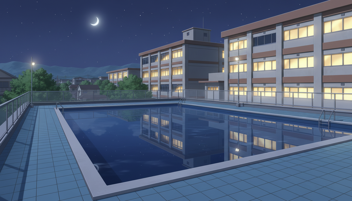 明かりのついた校舎と静まり返ったプールが美しく、落ち着いた夜の学園背景に最適です。