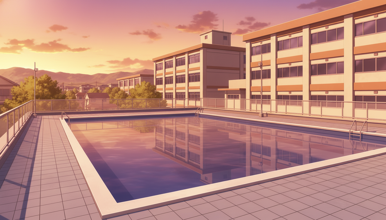 夕日に包まれた校舎とプールの反射が美しく、青春感のあるシーンにぴったりです。