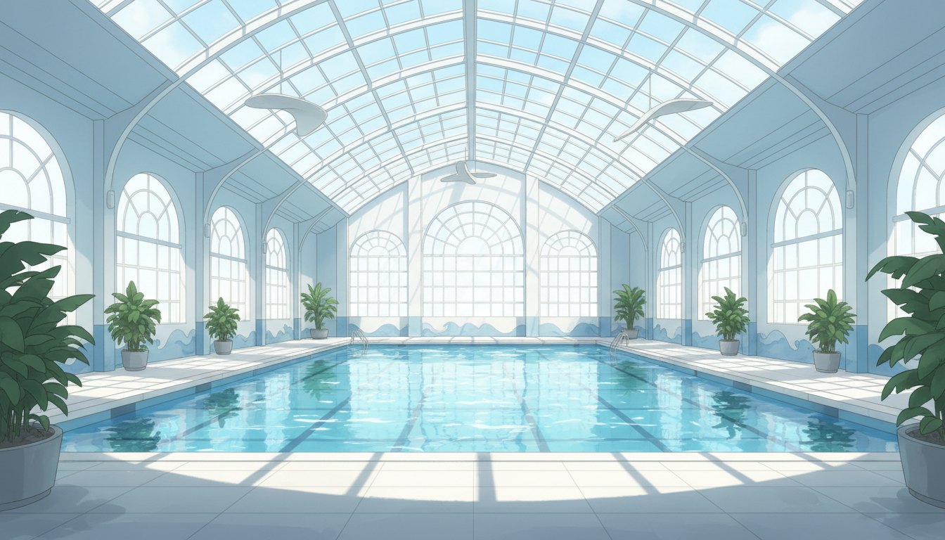 大きなアーチ窓とガラス天井から光が差し込む、明るく上品な屋内プール背景です。