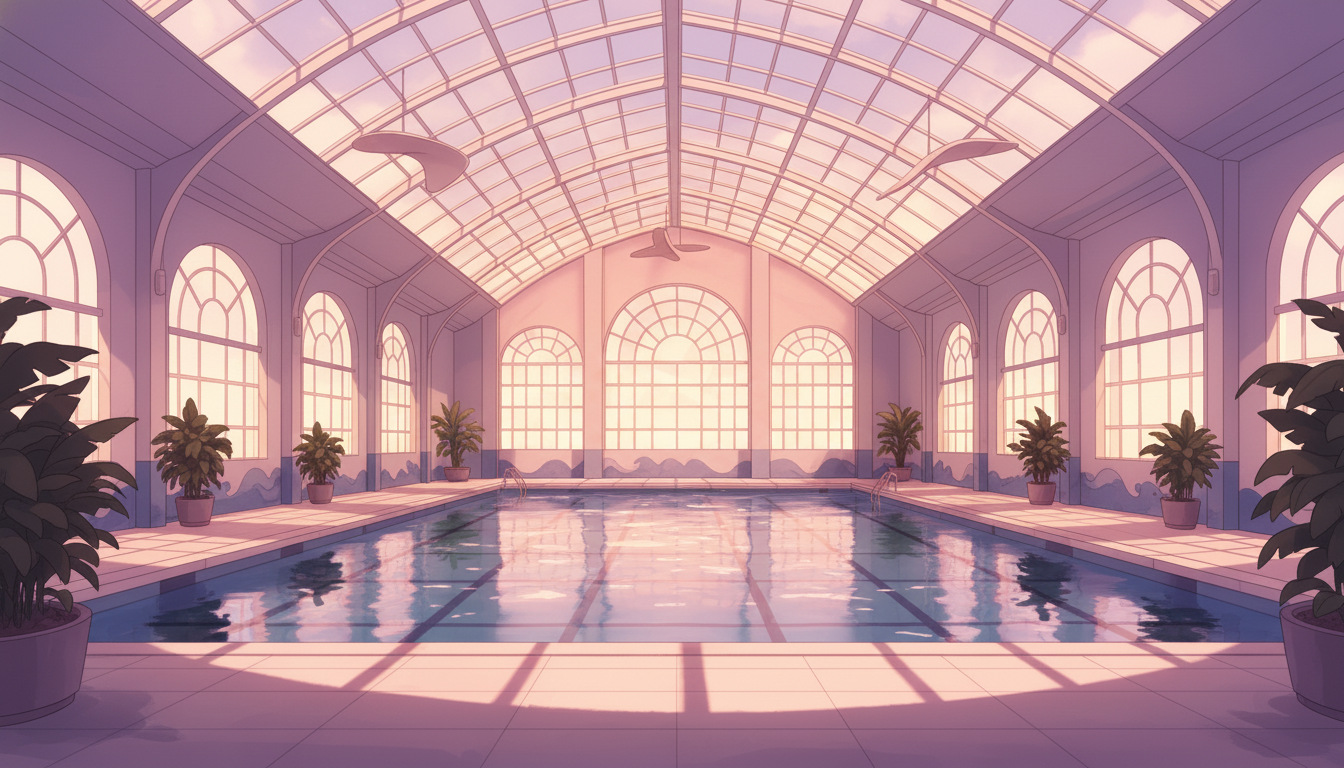 夕暮れに包まれた屋内温水プール|室内背景イラスト素材