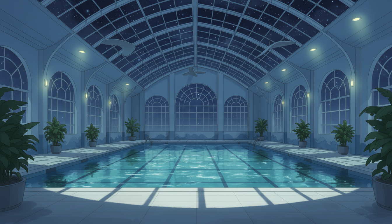 ガラス天井越しの星空と静かな水面が幻想的で、ロマンチックな夜の屋内プール背景です。