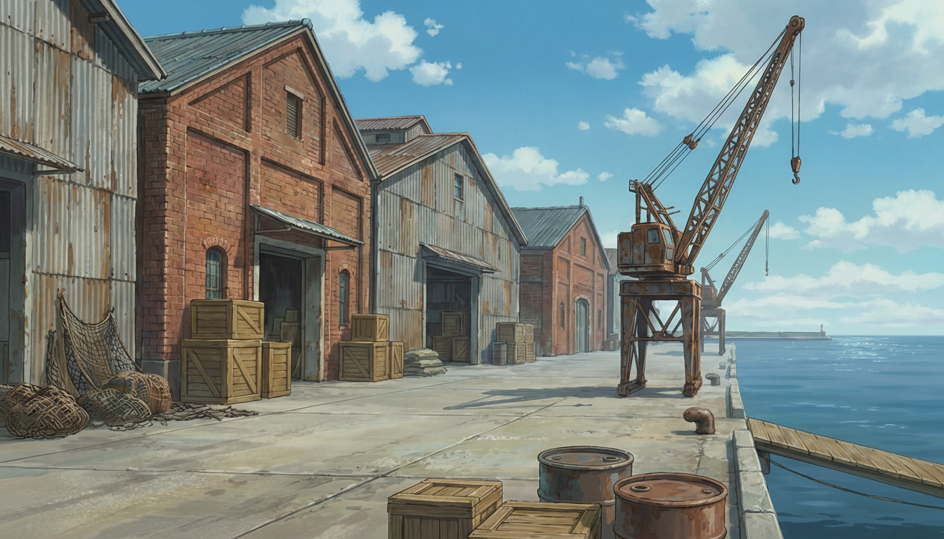 ■ 港の倉庫・コンテナのマンガ・アニメ背景イラスト(ダウンロード可)