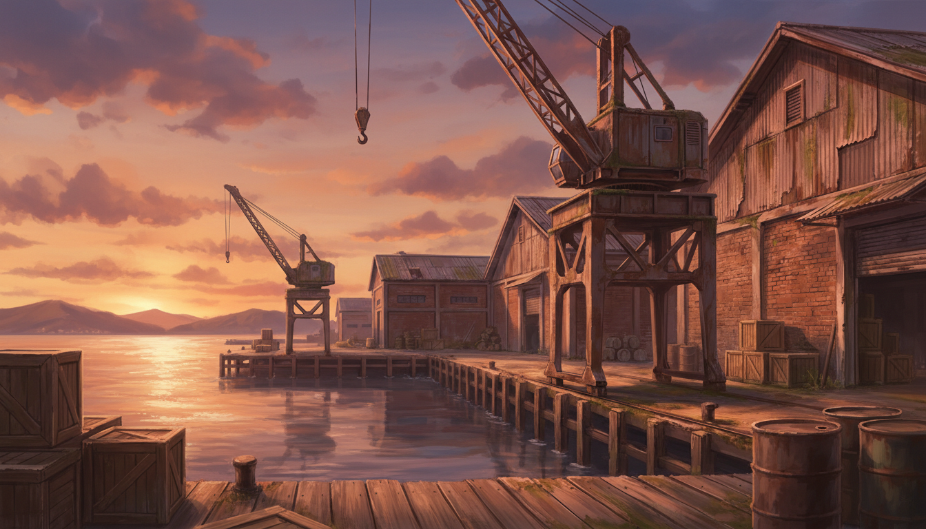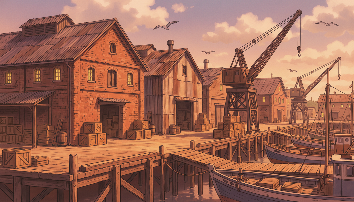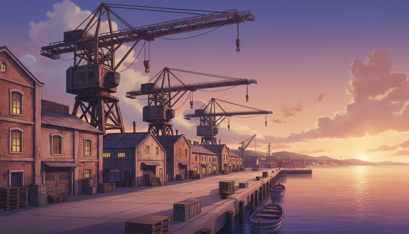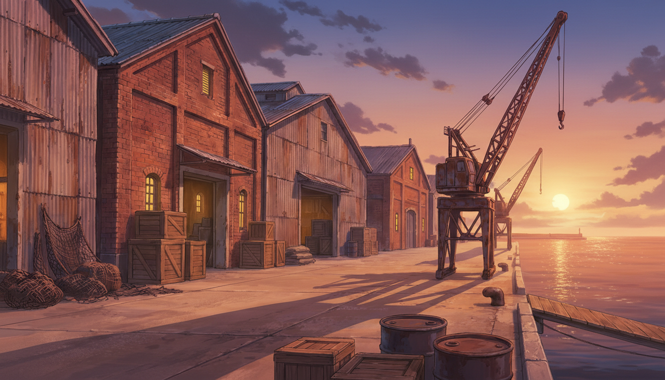 夕暮れの港町と倉庫群|情緒的な港湾イラスト素材