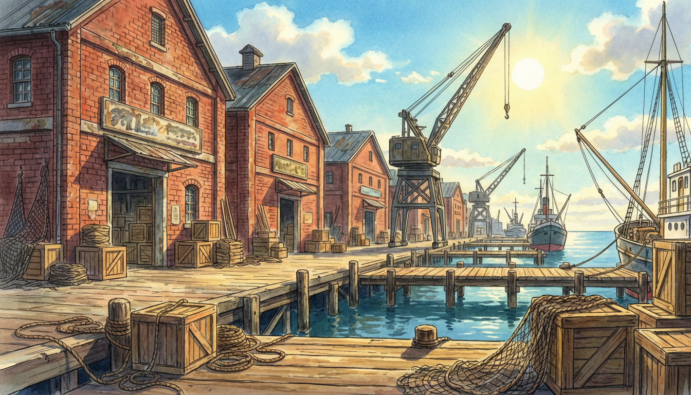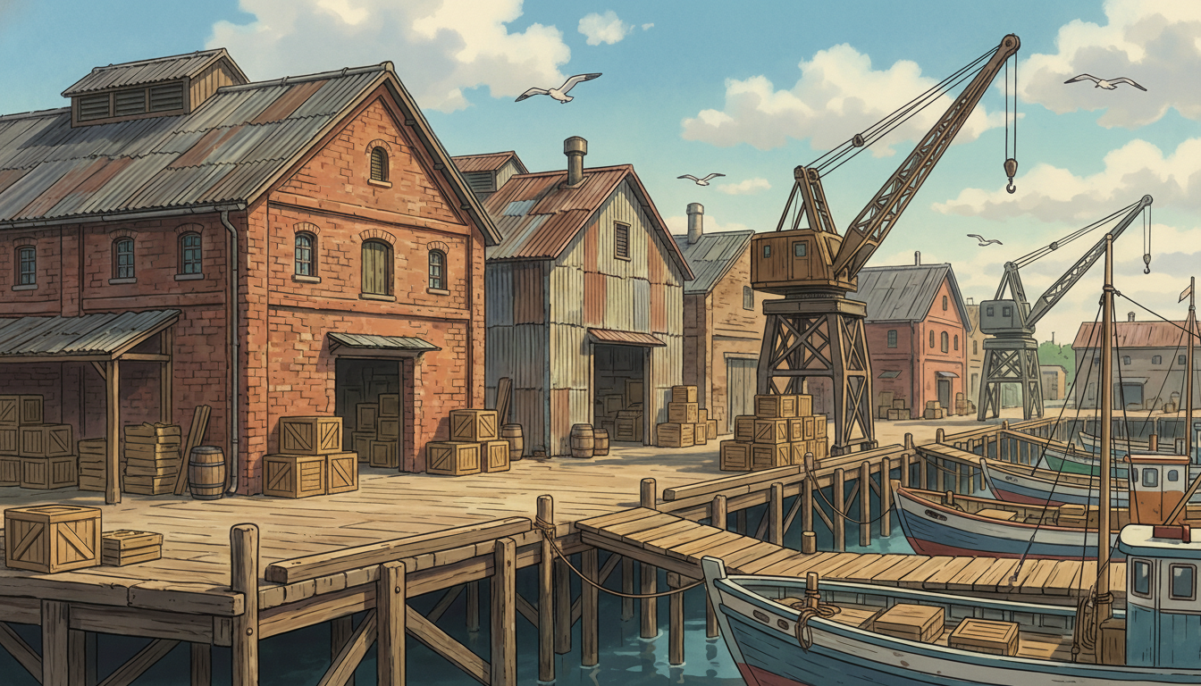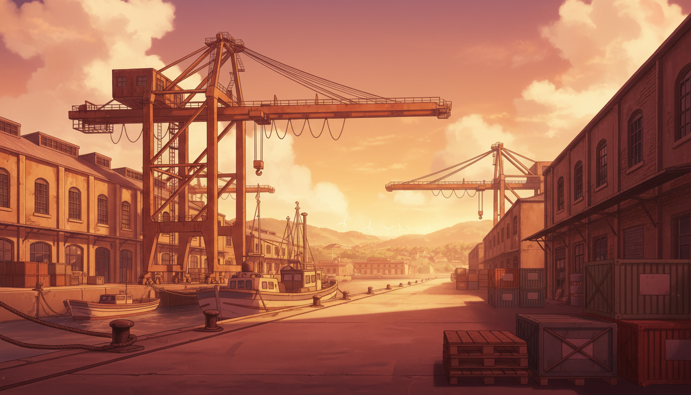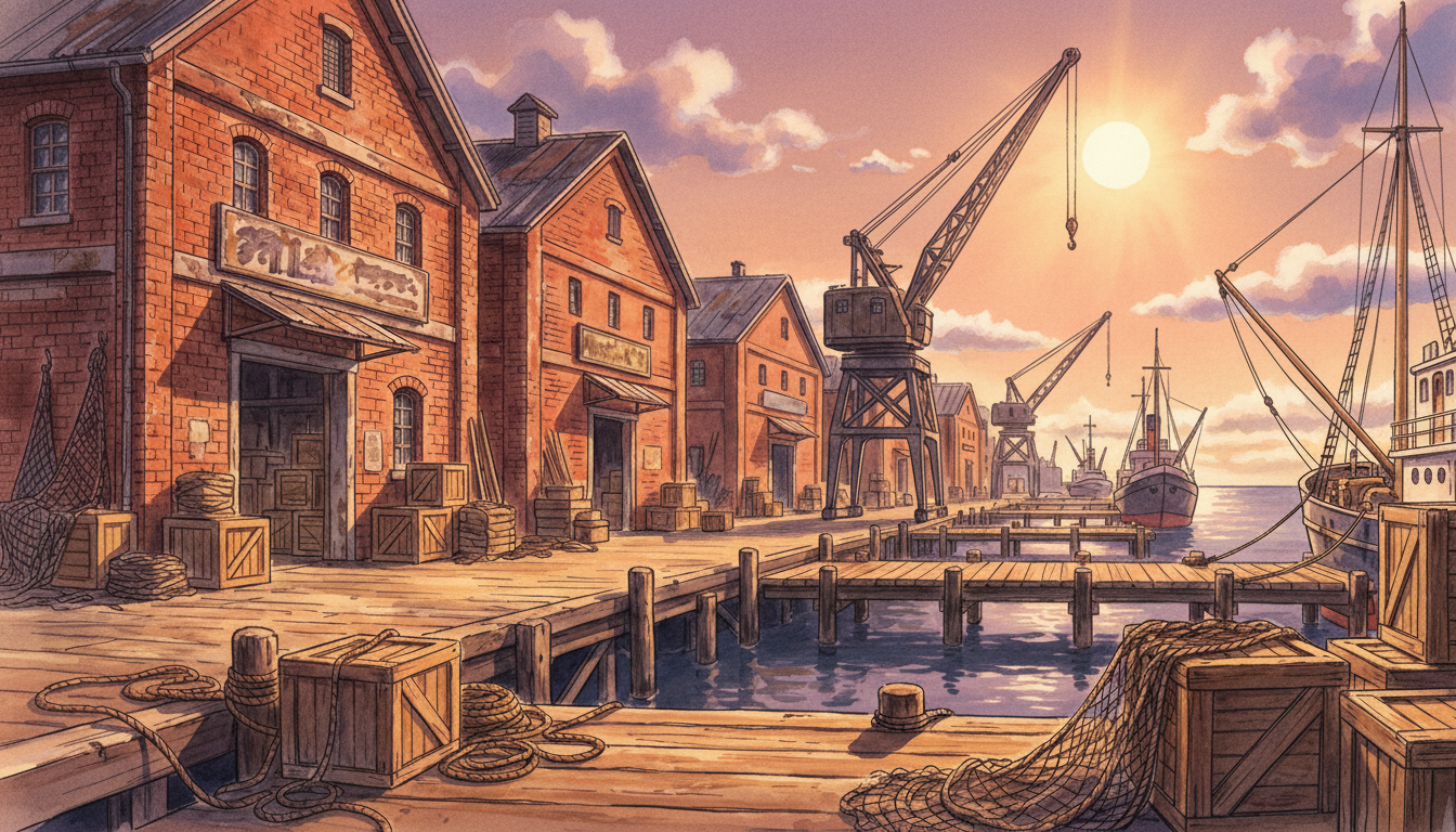 夕暮れの港町と倉庫群|情緒的な港湾イラスト素材