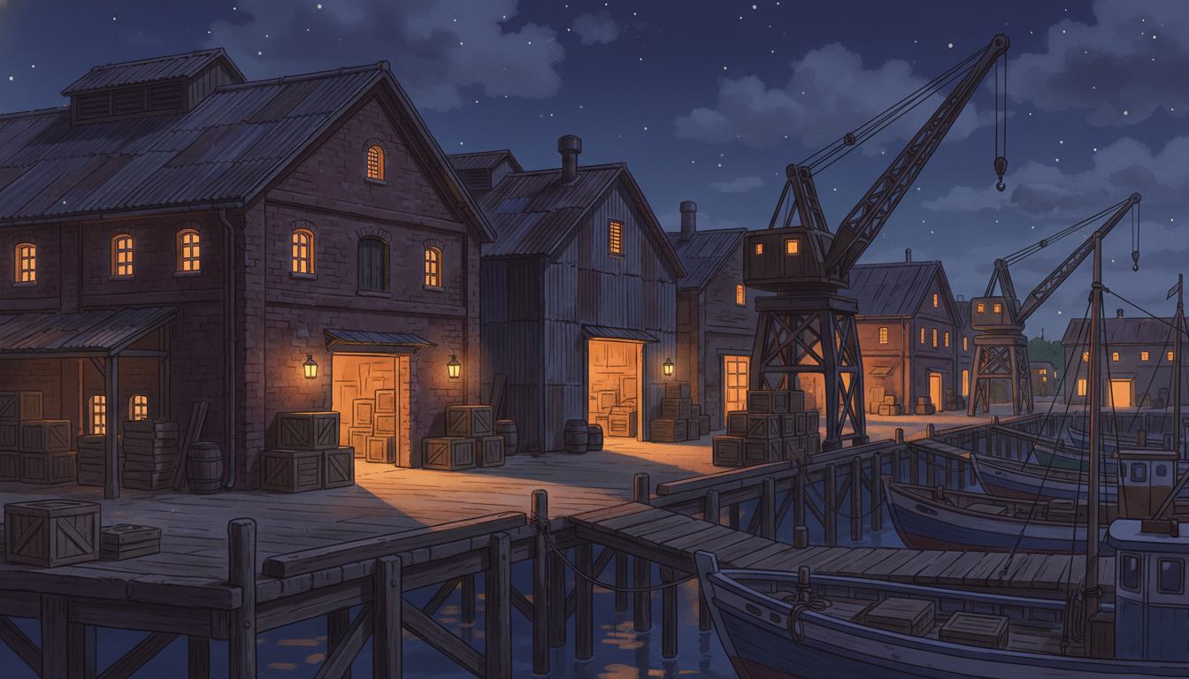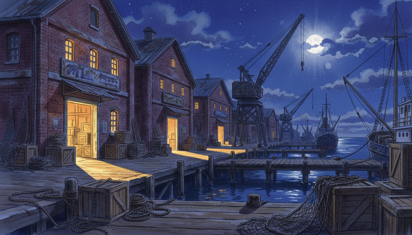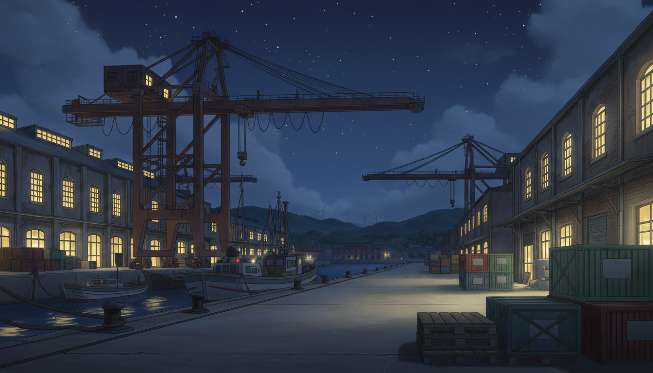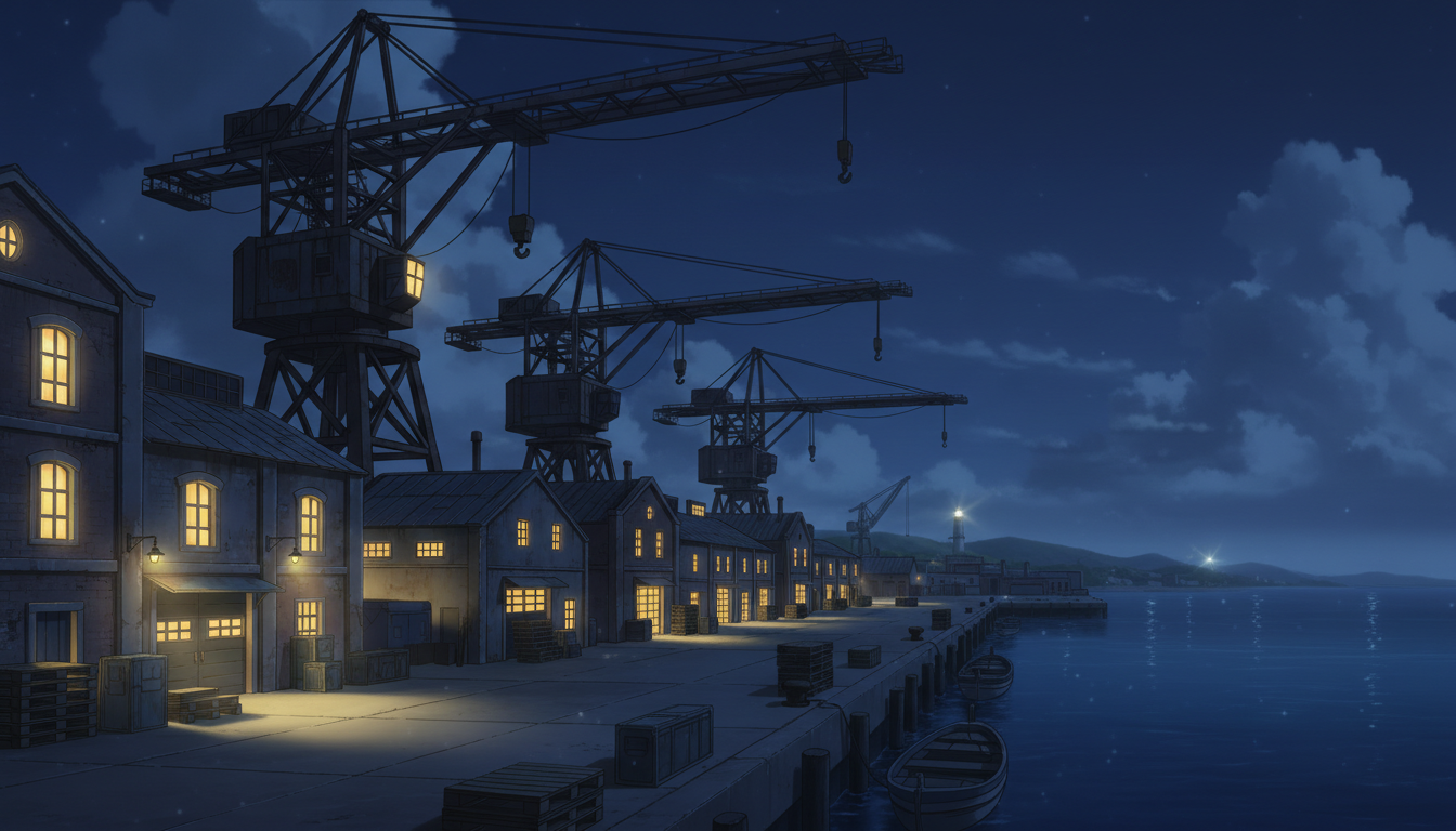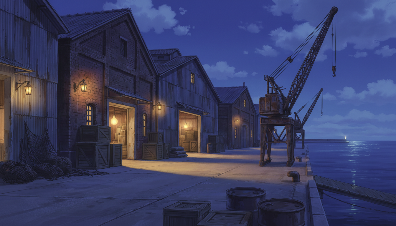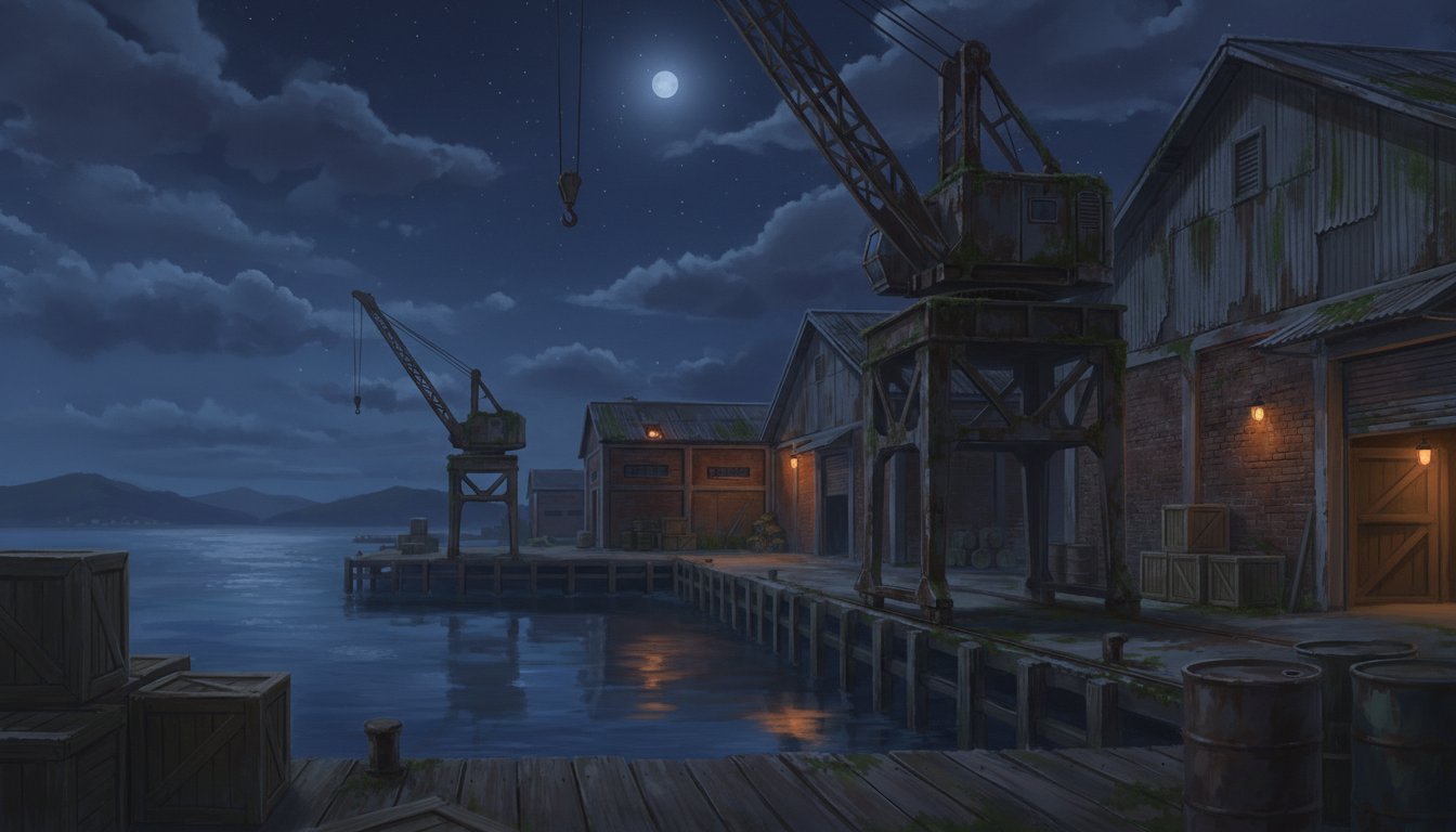 夜の静けさと倉庫街の灯りが際立つ、映画的な港湾背景素材です。