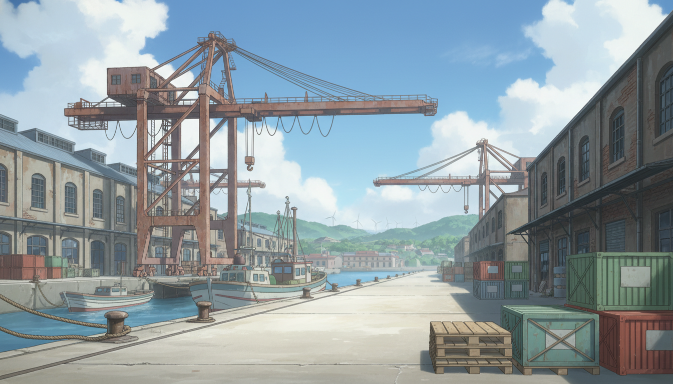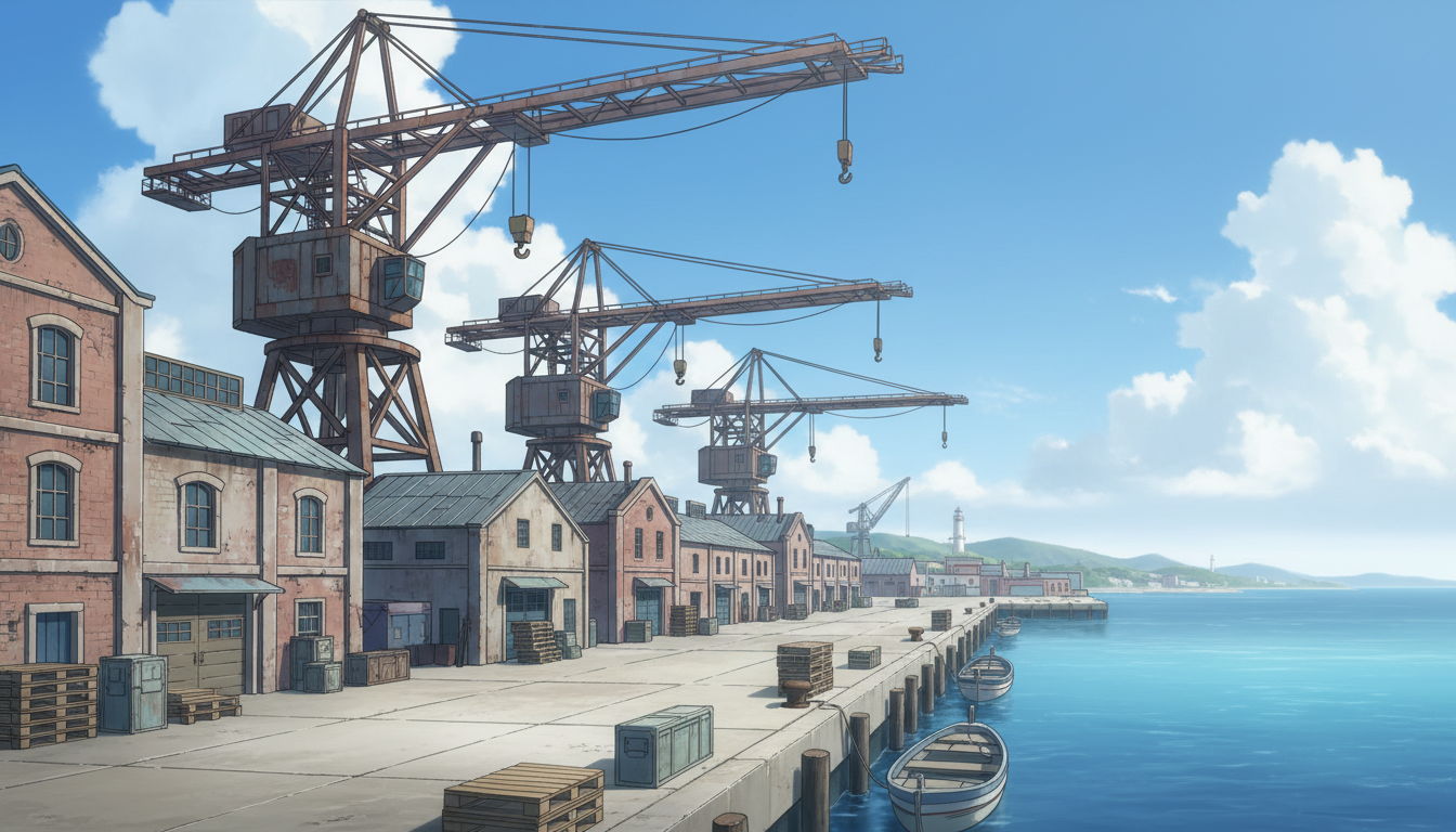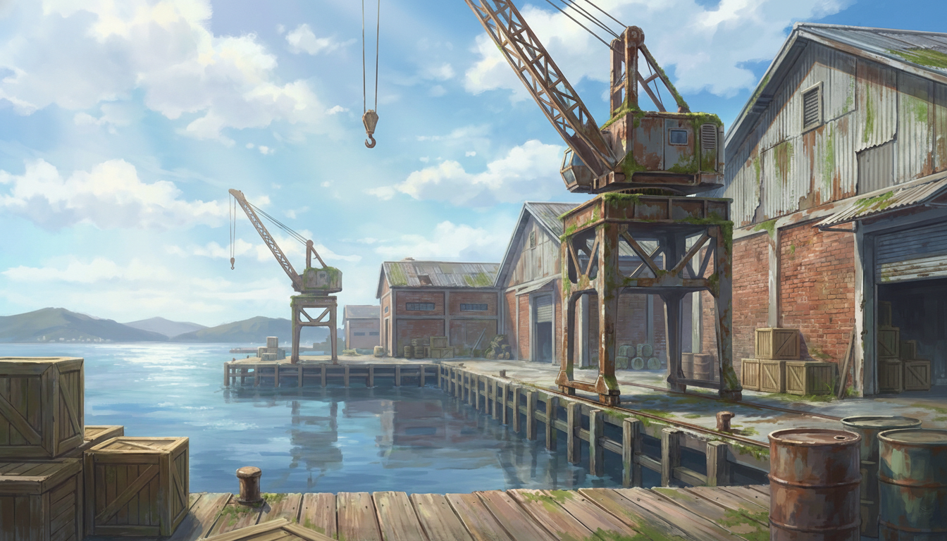 港の倉庫・コンテナの背景イラスト素材を無料配布。16:9の横長構図でPC向け作品に使いやすい背景イラストです。漫画・Webtoonやゲーム背景として商用・トレース利用もOK!