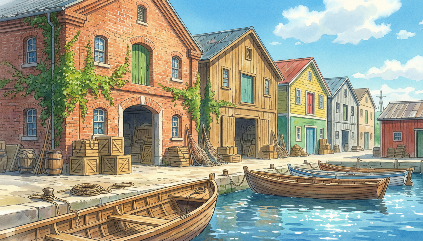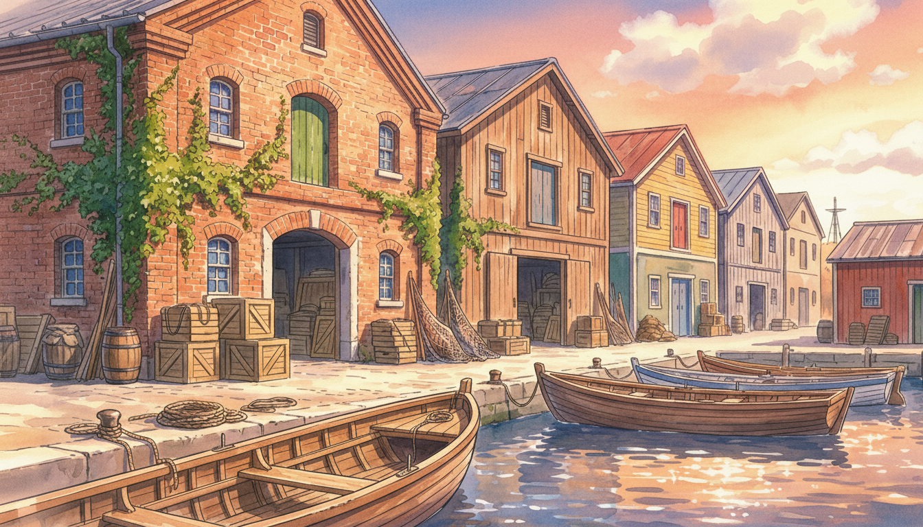 蔦に覆われた倉庫と小舟が並ぶ、温かみのある港町の背景素材です。