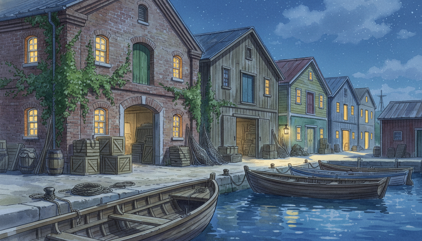 夜の港町と倉庫・小舟|静かな水辺の背景イラスト素材